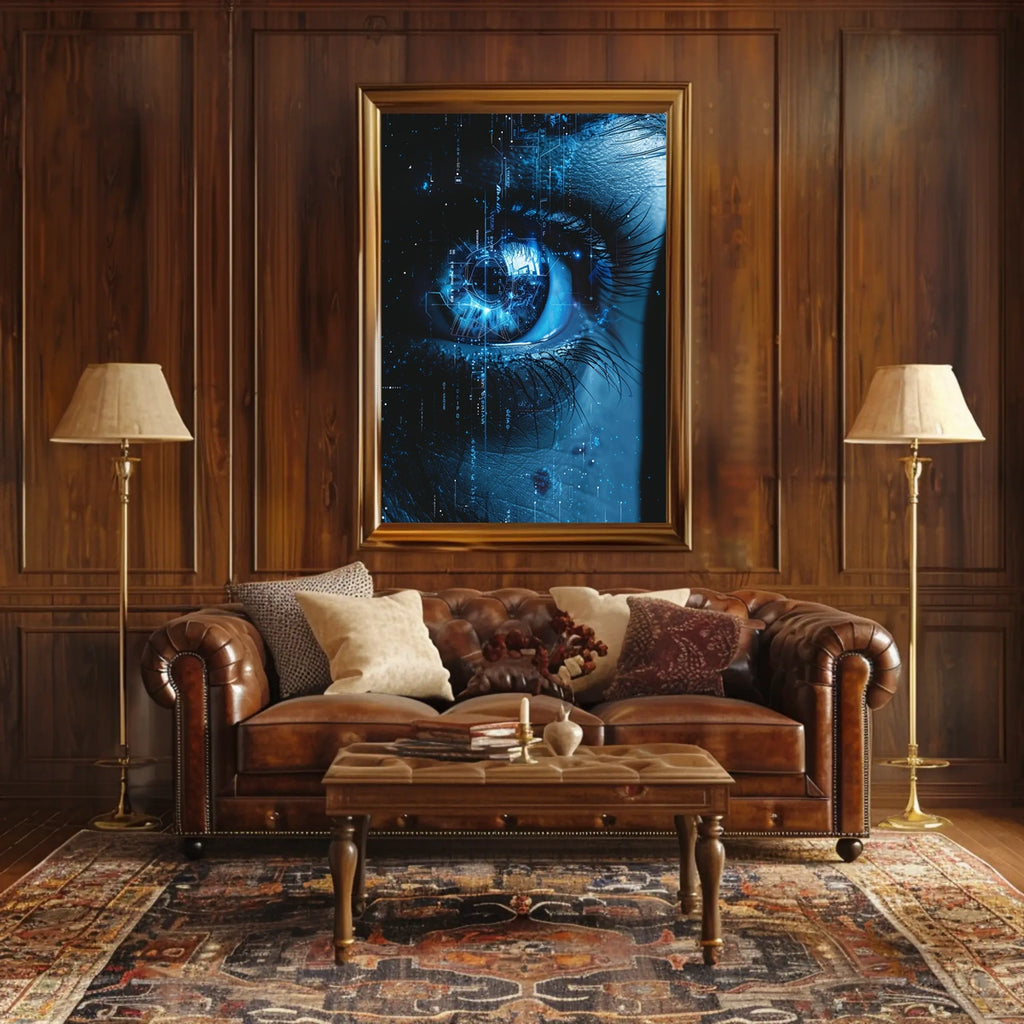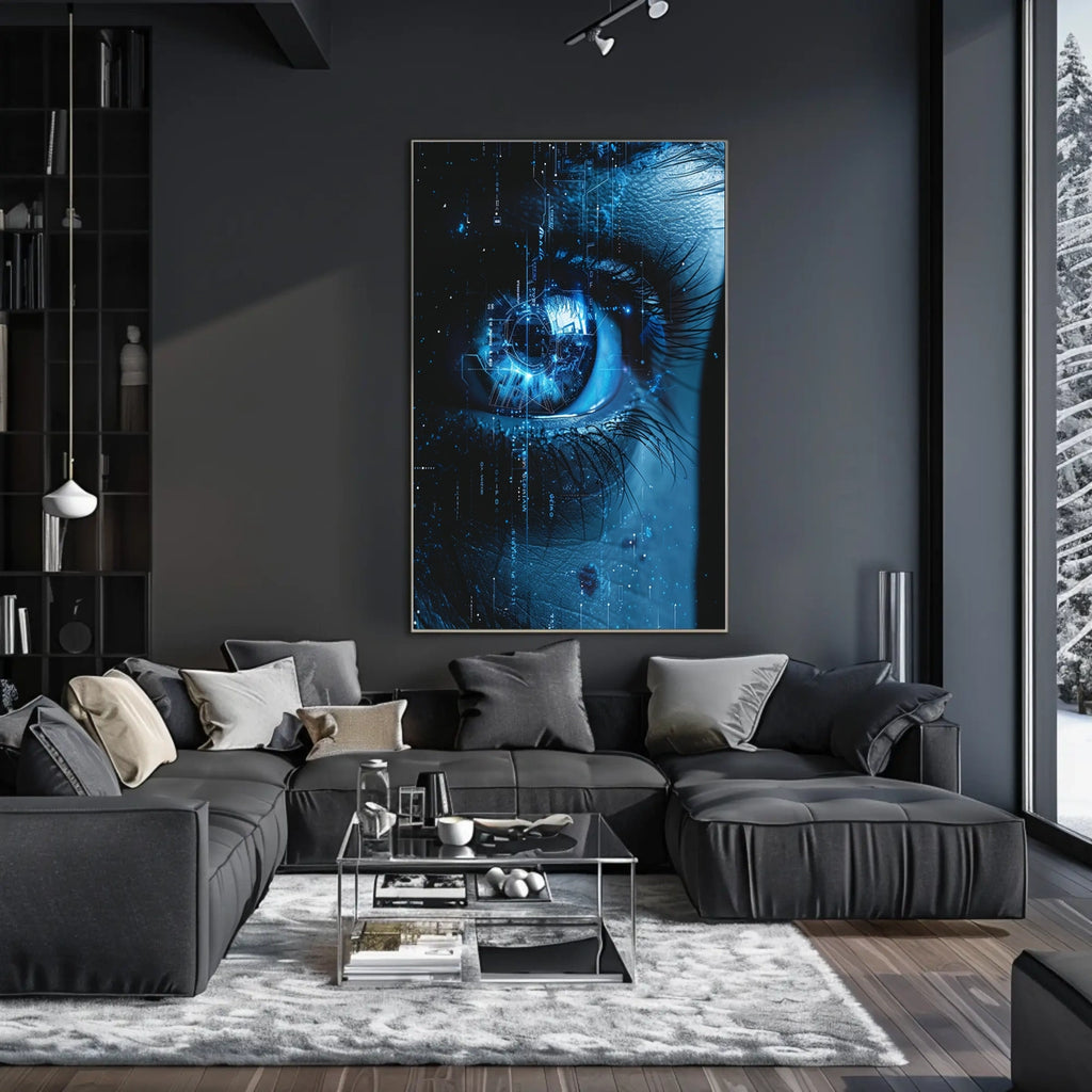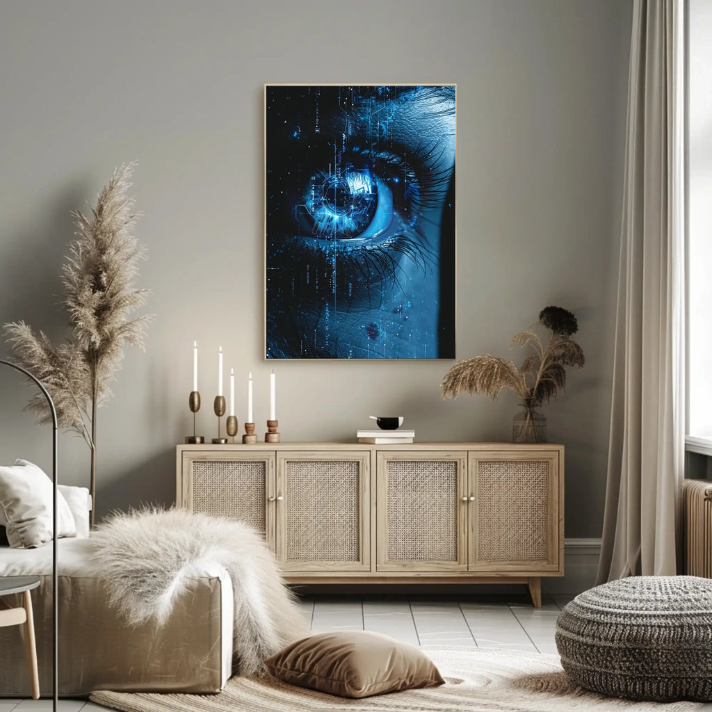 Intro: Dive into a future-forward visual that fuses human perception with digital insight. This striking poster blends a close-up human eye with digital elements, delivering a bold statement piece that captivates tech enthusiasts and futurists seeking visionary art for modern spaces and creative environments.