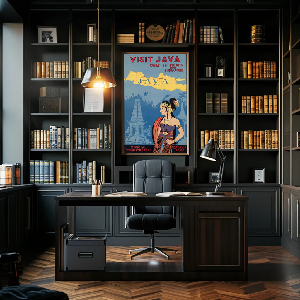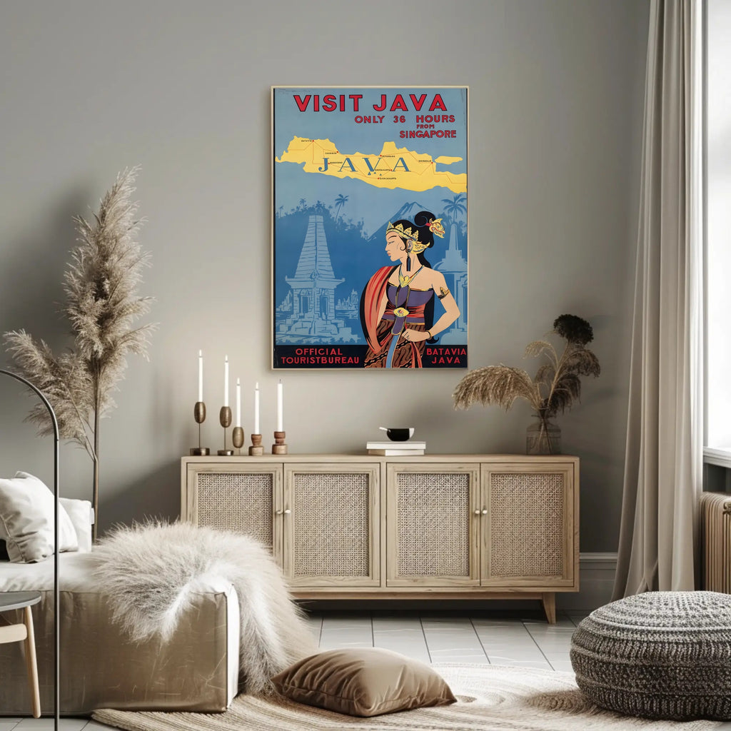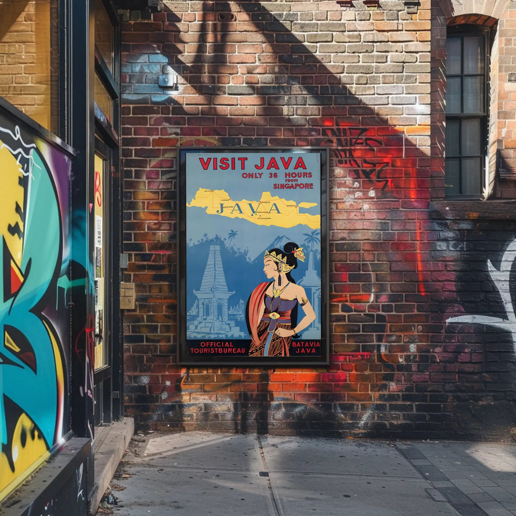 Embark on a journey back in time with this captivating vintage travel poster celebrating the allure of Java, Indonesia. Transport yourself to the early 20th century with its classic design featuring a vibrant map highlighting major cities like Batavia and Djokjakarta. The poster artfully blends traditional Indonesian cultural elements with the island's stunning landscape, including an iconic temple and volcano silhouette. The rich color palette of soft blues, yellows, and reds evokes an exotic, adventurous mood, making it an ideal piece for those who cherish history and travel. Perfect for home or office décor, this poster inspires wanderlust and appreciation for cultural heritage.