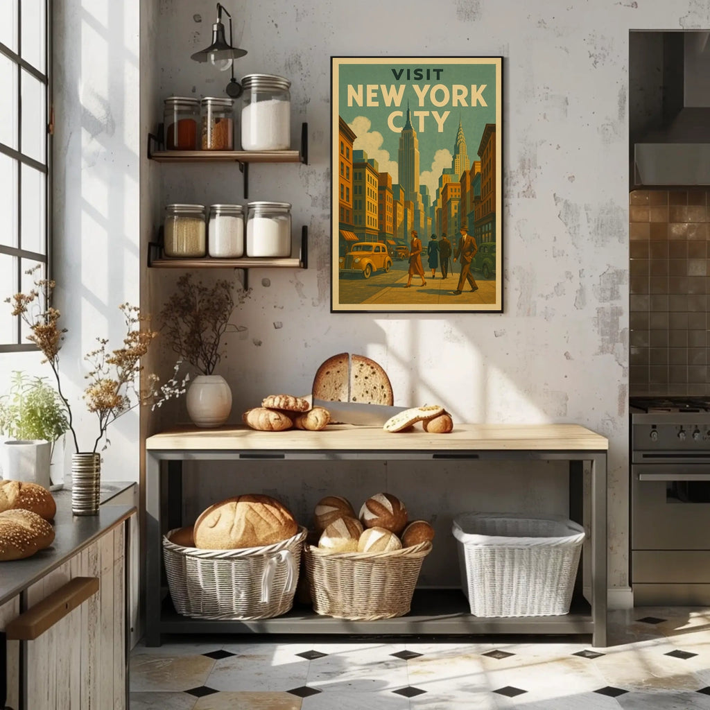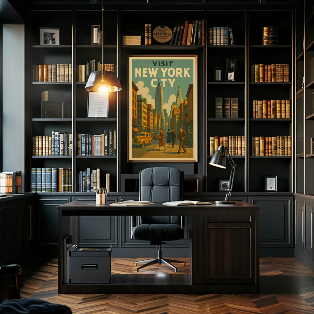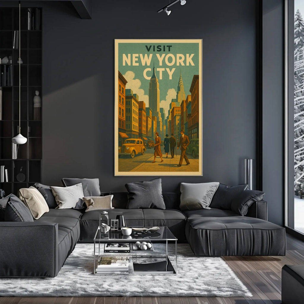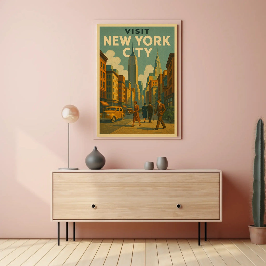 Transport your space to the gilded era of travel with this Visit New York Vintage Travel Poster. Featuring a bustling 1930s cityscape and iconic silhouettes, it captures the glamour and energy of New York City, turning any wall into a timeless, conversation-starting focal point.