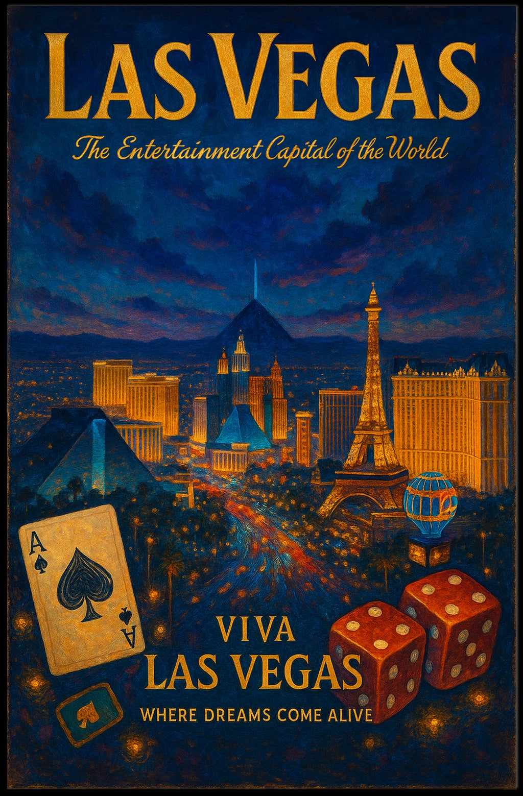 Capture the dazzling allure of Las Vegas with this vibrant poster. Celebrating the city's iconic skyline and landmarks—Luxor pyramid and Eiffel Tower replicas—it brings casino glamour and high-energy charm into any room.