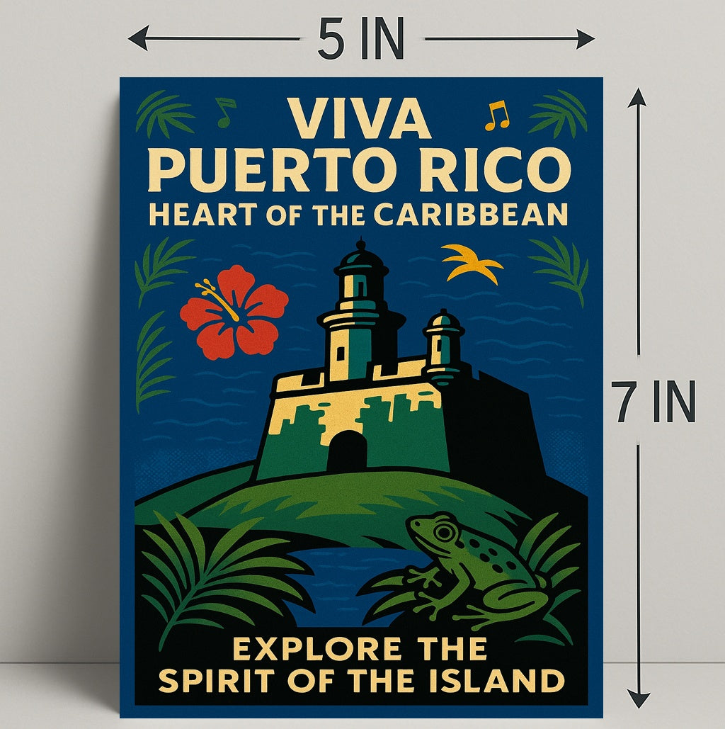 - Vintage pop-art design: Bold typography reading “Viva Puerto Rico — Heart of the Caribbean” pairs with stylized illustration for an authentic mid-century travel-poster look.