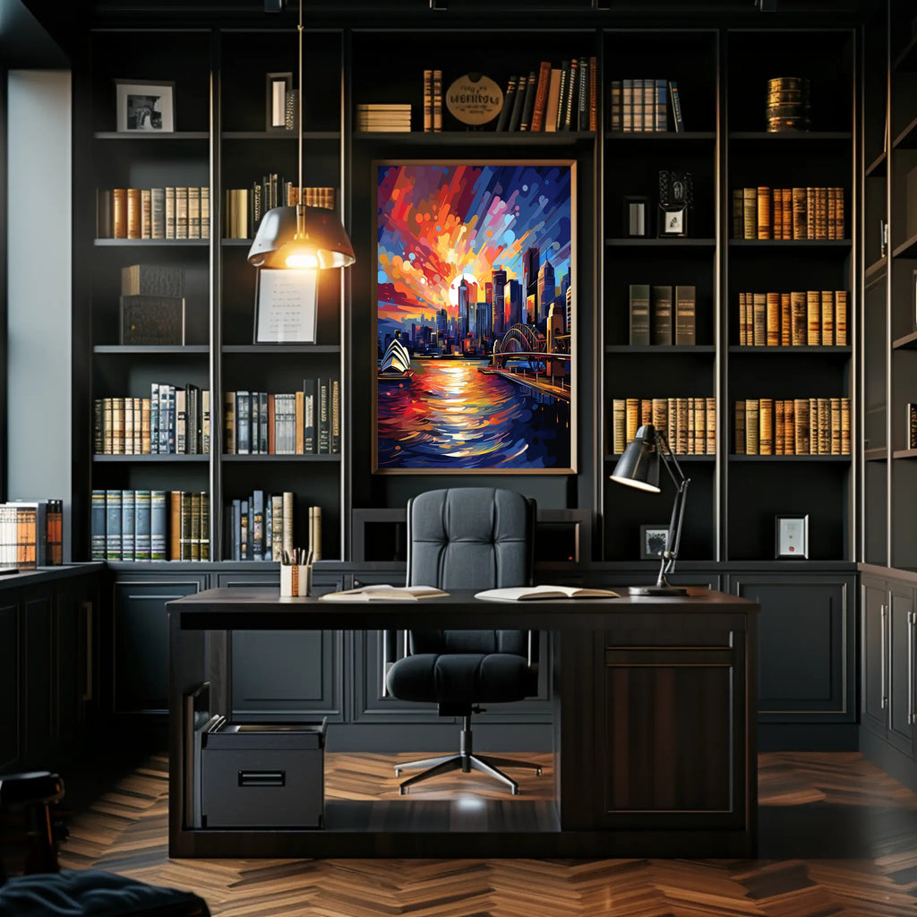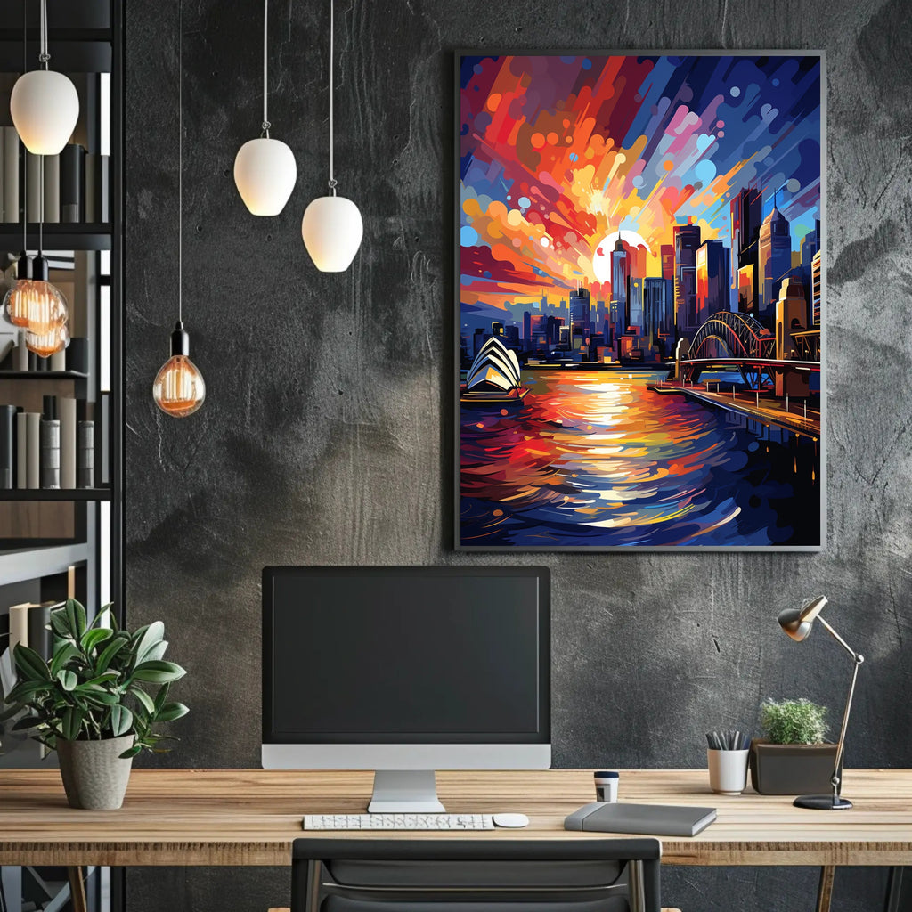 Vivid Cityscape At Sunset Poster — ignite any room with a bold, pop-art-inspired city sunset from PosterGoat. This high-impact poster captures a bustling skyline reflected in shimmering harbor waters, exploding with warm oranges, deep blues and dynamic brush-like strokes that command attention.