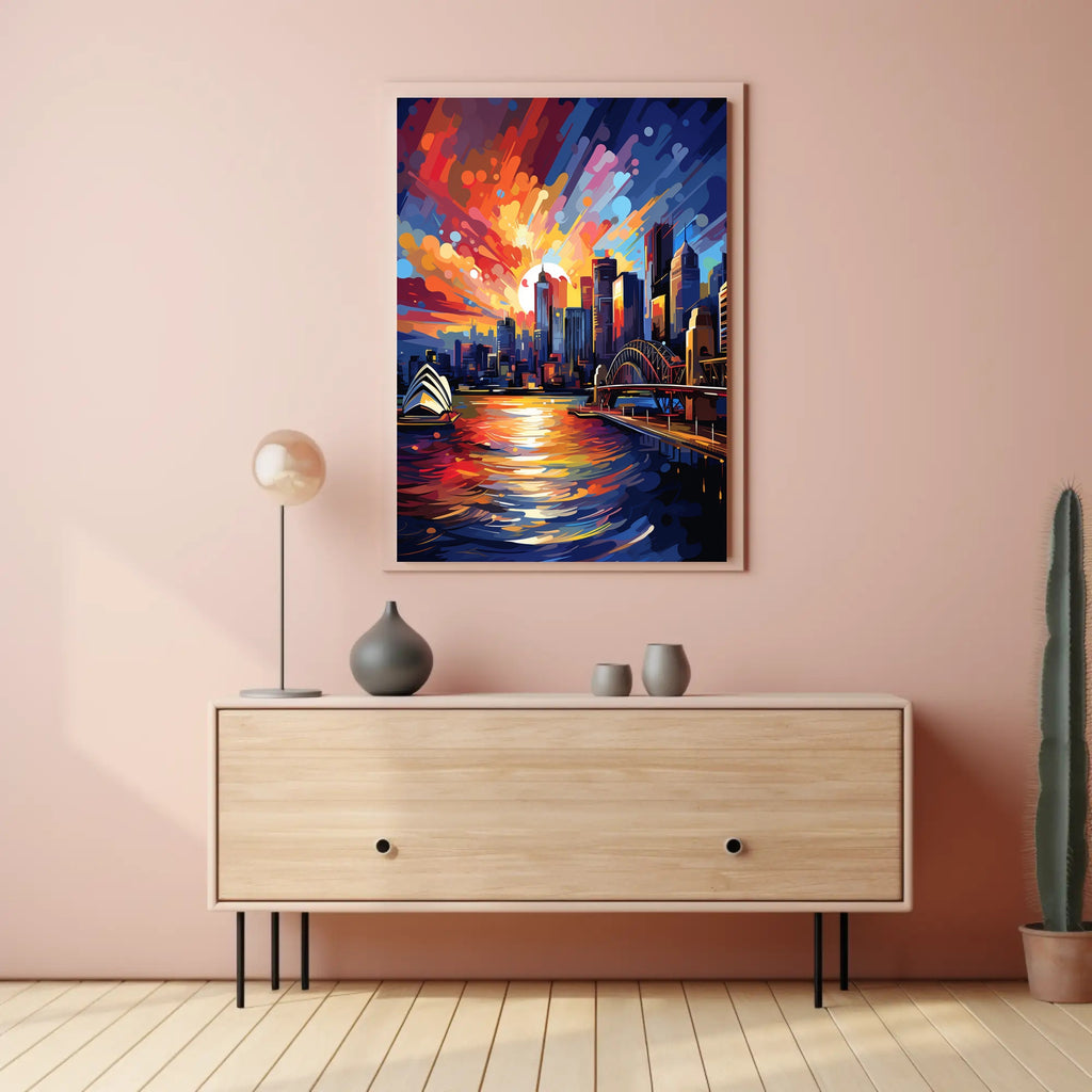 Elevate your space with the Vivid Cityscape At Sunset Poster from PosterGoat — add it to your cart today and bring a sunset metropolis to life on your wall.