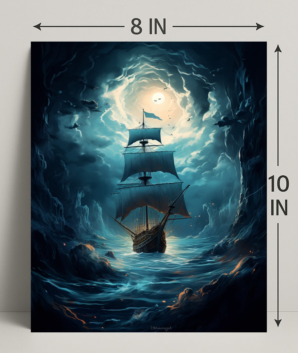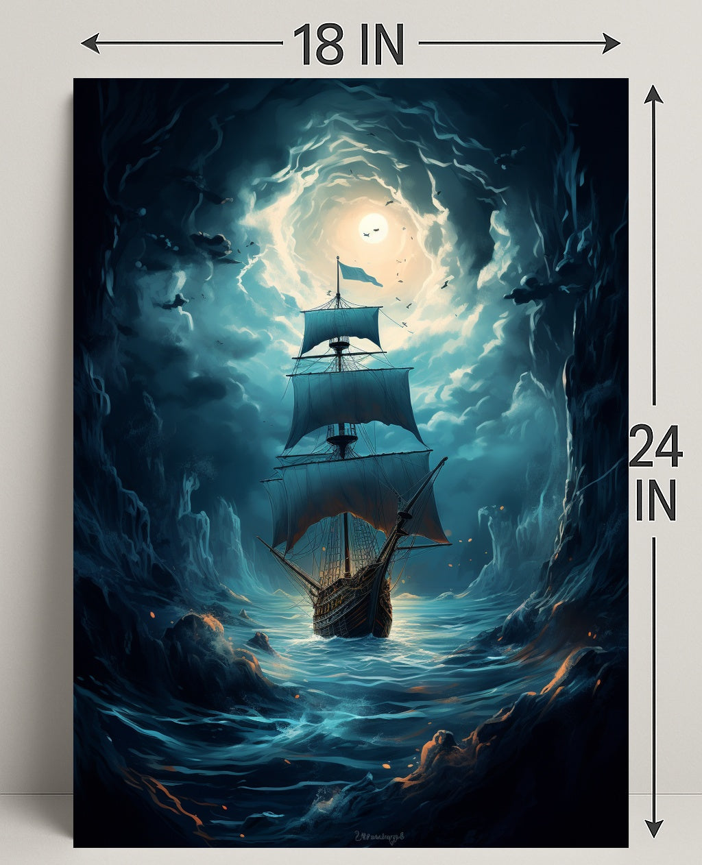 Striking visual narrative: Dynamic composition with a central sailing ship framed by swirling clouds and luminous moonlight — perfect for travel and places themed décor.
