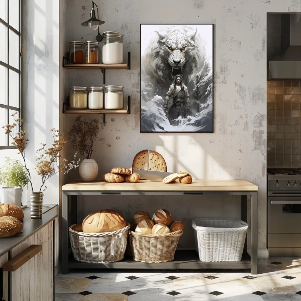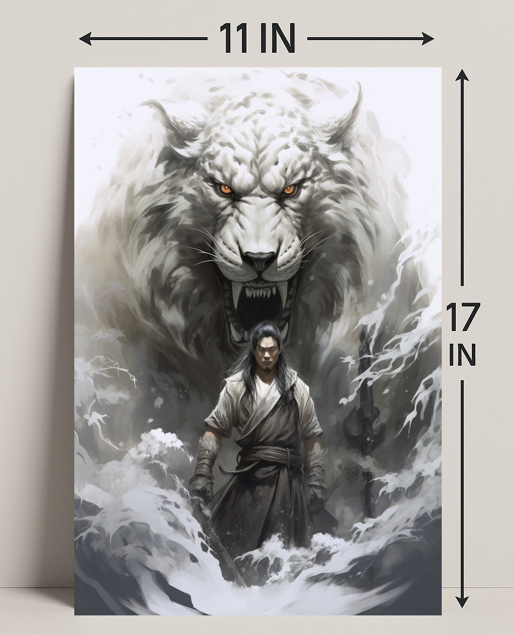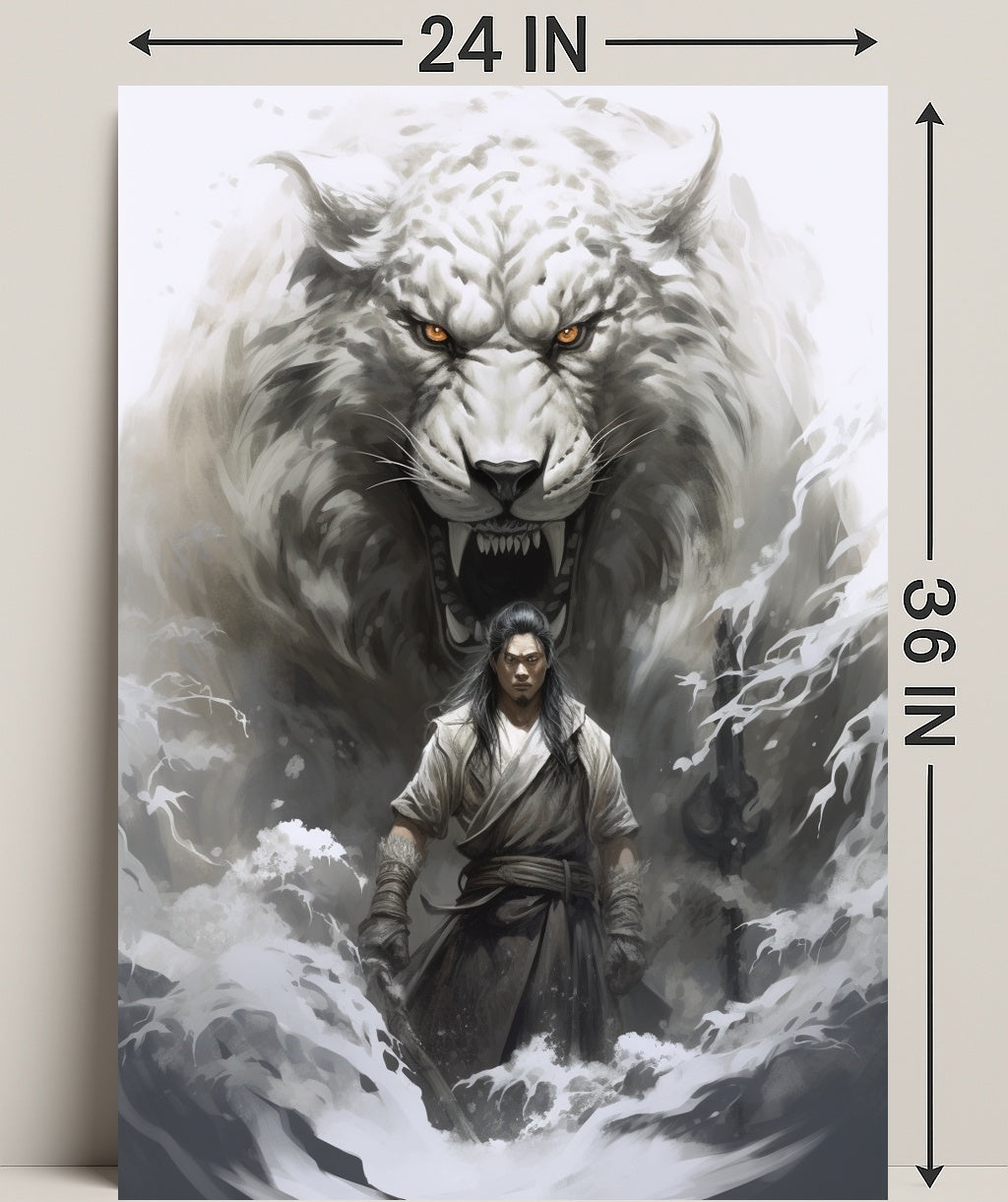 - Striking composition: A towering white tiger looms behind a lone warrior, framed by dynamic waves and mist — a cinematic focal point that creates depth and movement in any room.