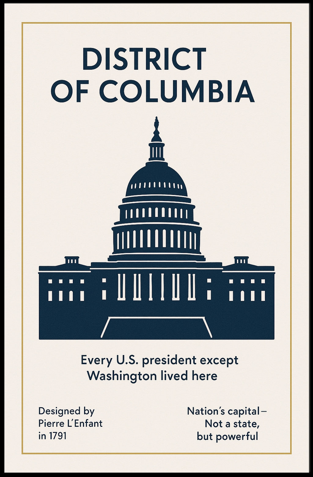 Celebrate America's capital with the Washington D.C. — The Nation’s Capital Poster by PosterGoat. This elegant art print features a bold navy silhouette of the U.S. Capitol set against a warm cream background, framed by a thin gold inner border and classic, vintage-inspired typography — a refined focal point for living rooms, offices, or study nooks.