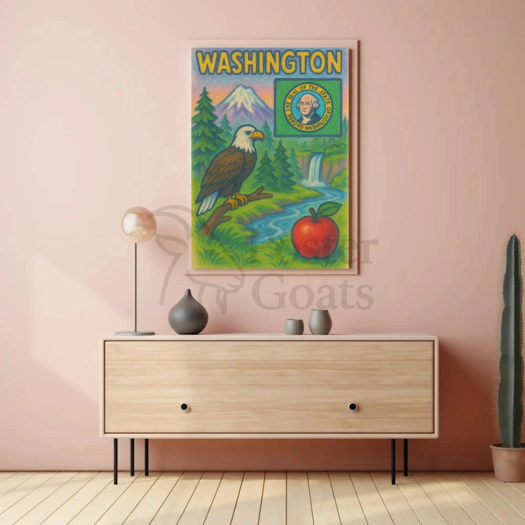 Bring Washington State's iconic landscapes and patriotic spirit into your home with this vibrant travel poster from PosterGoat. Rendered in a colorful illustrative style that nods to vintage travel art and pop art typography, the design features a majestic bald eagle perching above a winding river, a snow-capped Mount Rainier, a serene waterfall, the state seal, and a bold apple—symbols of the state's natural beauty and agricultural heritage.