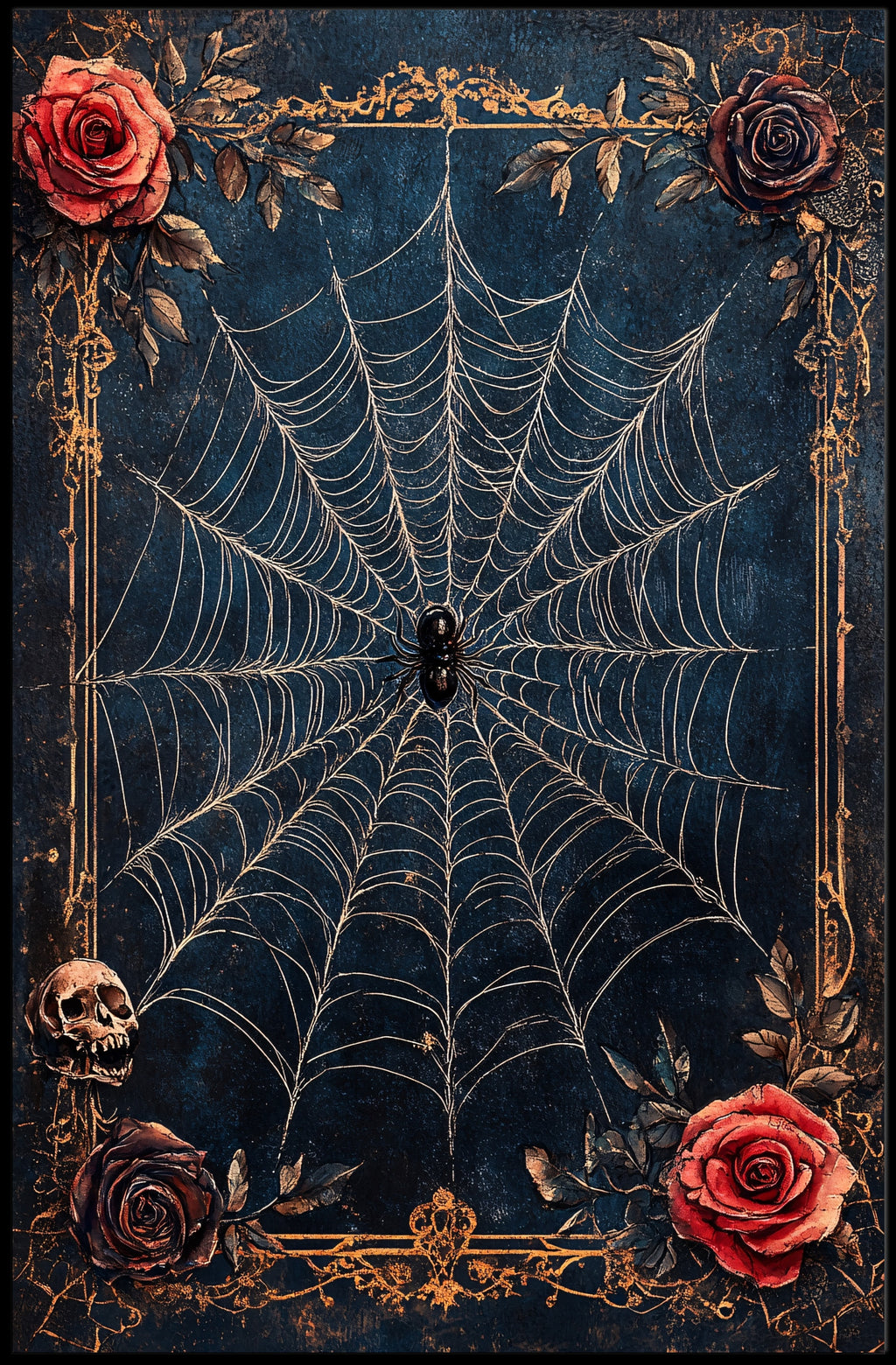 Striking focal design: An intricately drawn spider web radiates from the center, anchored by a glossy black spider — a bold, evocative motif that balances eerie charm with artistic sophistication.