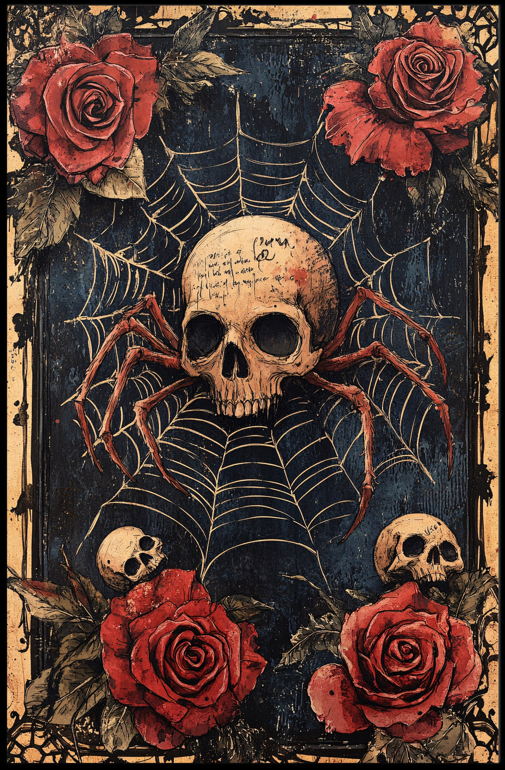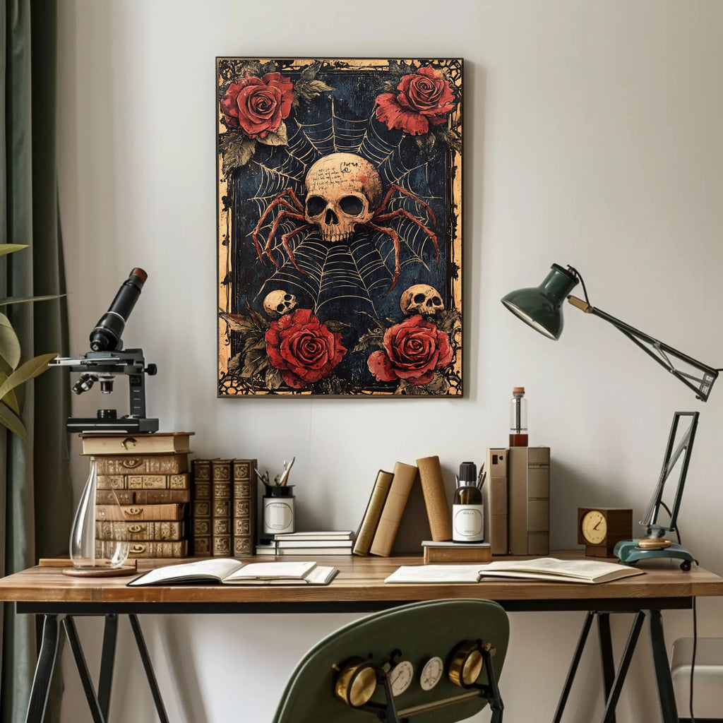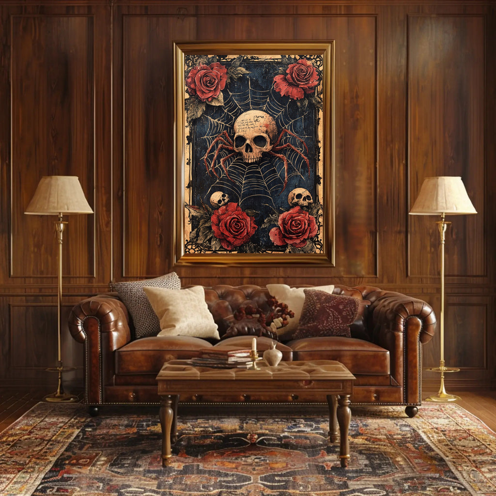 Standout design: Intricate skull-and-web composition framed by richly textured roses — perfect for Halloween decor, gothic interiors, or anyone who loves edgy wall art.