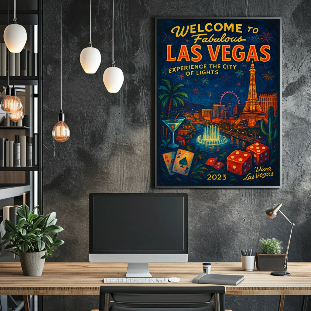 Enhance any space with this captivating Las Vegas poster—a bold, stylish accent that celebrates the City of Lights. Add to cart now to elevate your decor with timeless Vegas glamour and vibrant art.