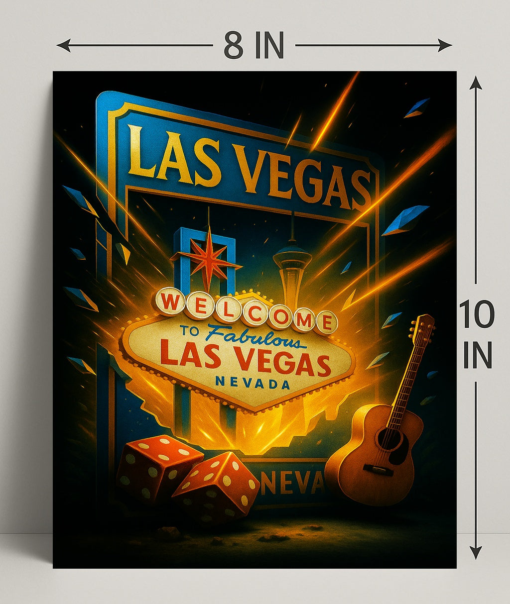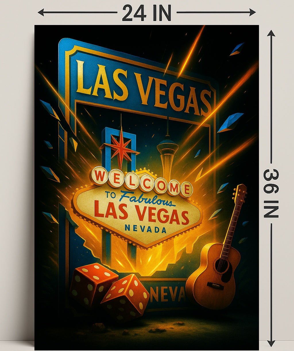 Bring the electric energy of the Strip into your home with the Welcome to Fabulous Las Vegas Poster from PosterGoat — a bold pop art poster that captures the iconic neon sign bursting with light, a pair of dice, and an acoustic guitar against a dramatic, star-splashed skyline.