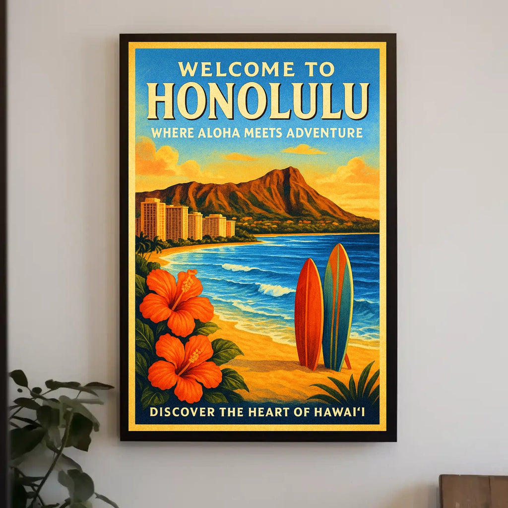 Bright and breezy, this Welcome to Honolulu poster brings a relaxed island vibe into any space. Drawing on real-world scenery, it nods to Travel & Places, Nature & Landscapes, and Cultural Heritage, with a clean Art Deco touch that feels timeless in a living room, bedroom, or hallway.