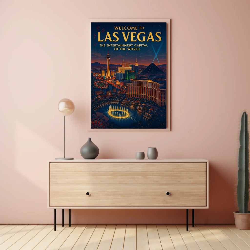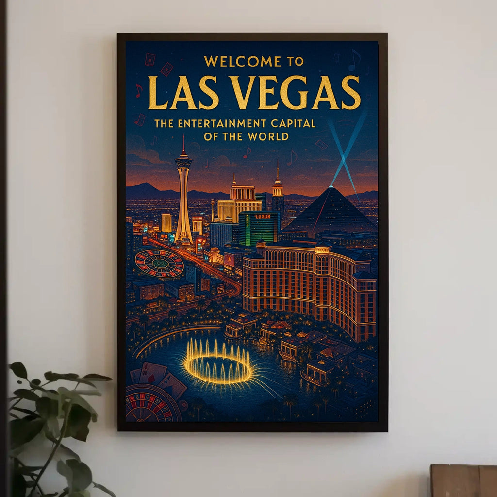 Immerse your space in the electric energy of Las Vegas with this striking poster. Celebrating the iconic skyline, dazzling lights, and famed landmarks, it brings the Entertainment Capital of the World into any room with bold style.