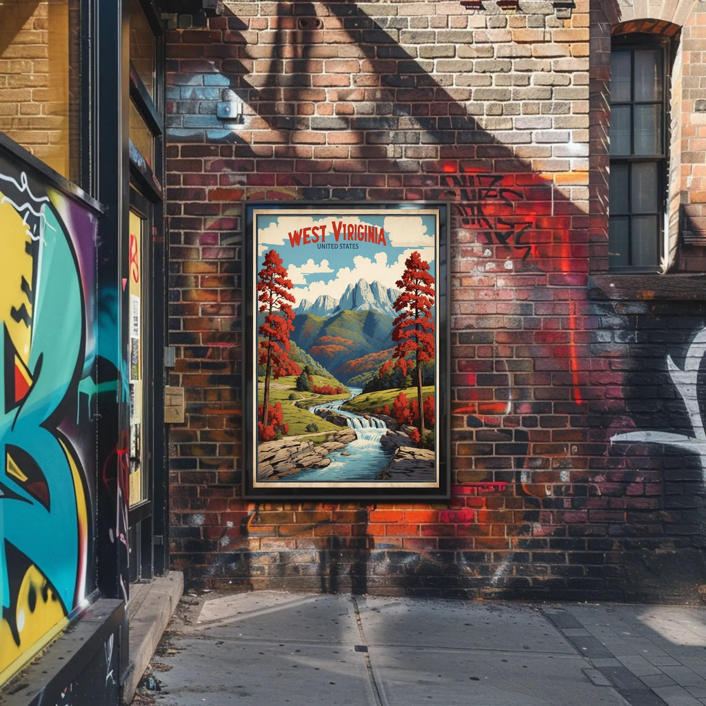 Capture the quiet majesty of Appalachia with the West Virginia Scenic Autumn Travel Poster — a vintage-inspired print from PosterGoat that transforms any room into a cozy travel retreat. Illustrated with a cascading river threading through rocky terrain, bright red autumn trees, and a backdrop of rugged mountain peaks beneath a sky of fluffy clouds, this poster evokes a nostalgic, serene natural scene perfect for home & garden décor.
