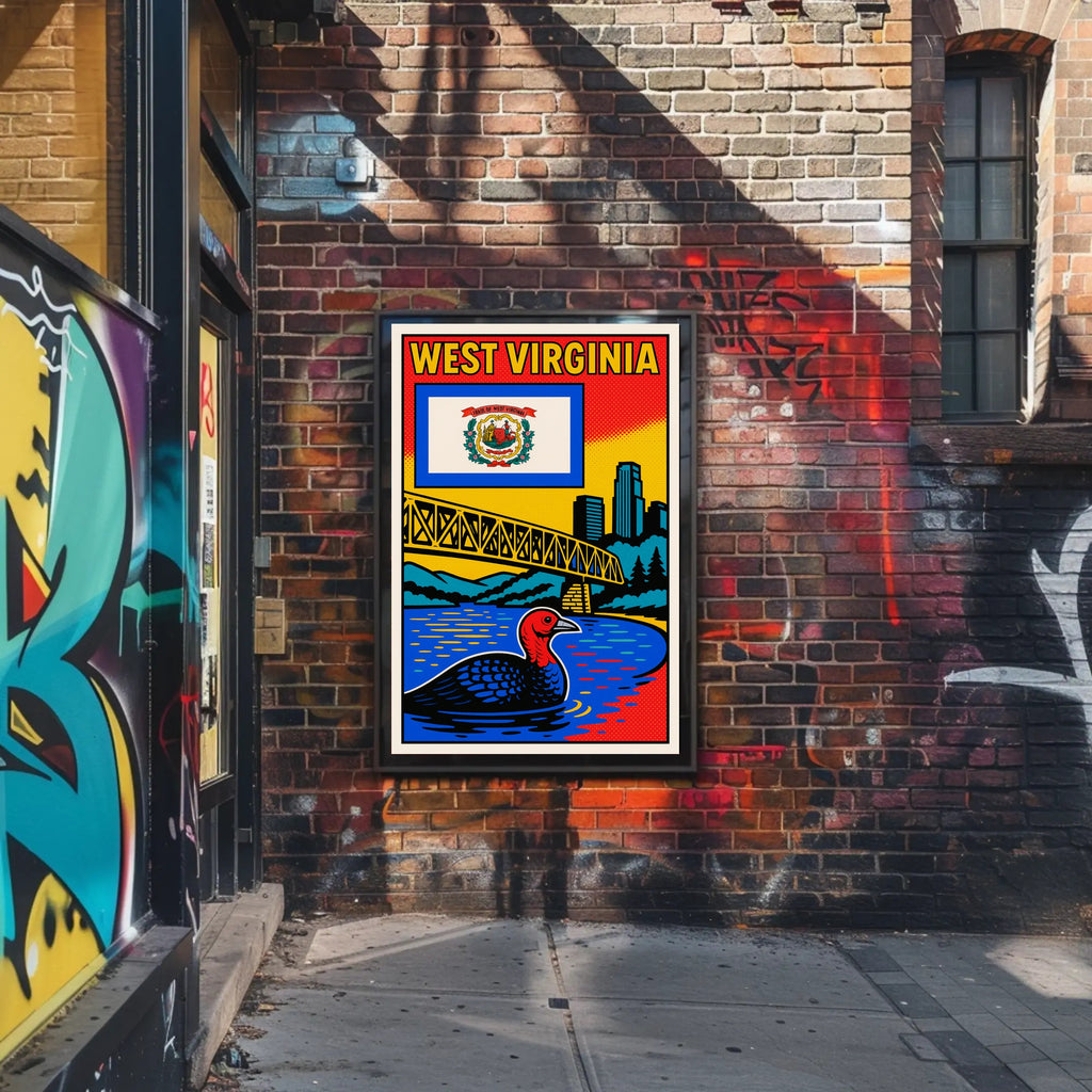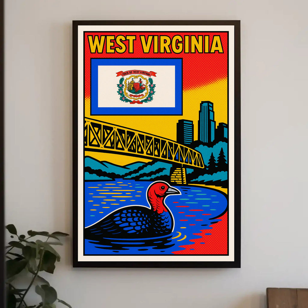 West Virginia Tribute Poster by PosterGoat brings a vibrant, pop-art celebration of West Virginia to your walls — bold typography, a stylized state flag, a sweeping bridge and skyline, and a striking waterfowl rendered in high-contrast color. This 18x24 poster captures the spirit of travel and place with a minimalist, modern composition ideal for living rooms, offices, or cabin decor.