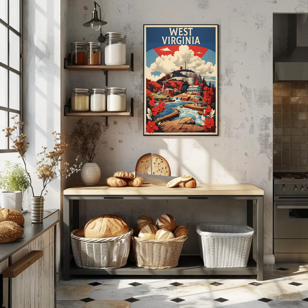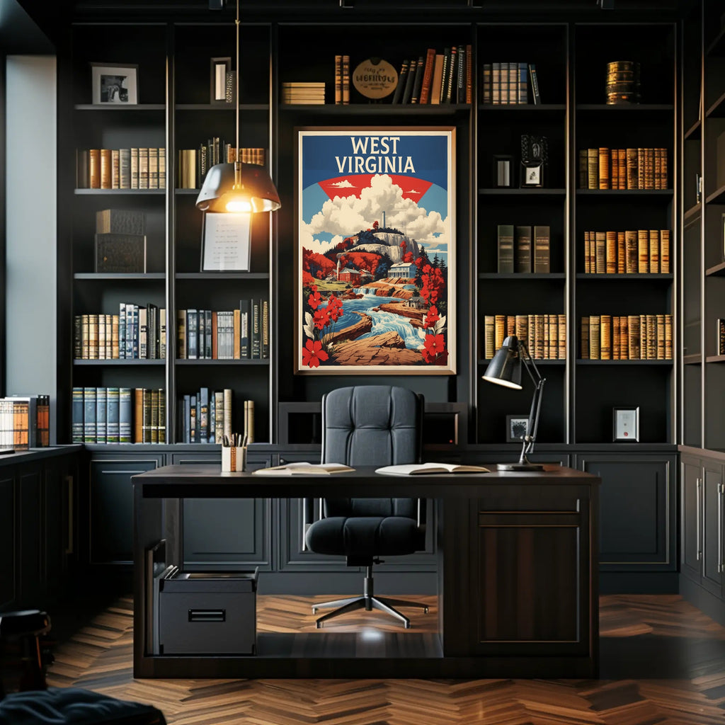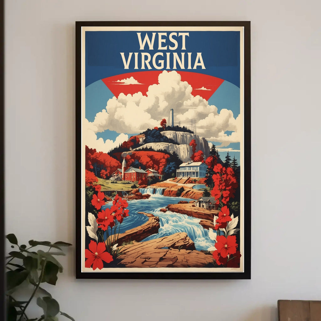 Capture the essence of West Virginia with this vibrant, vintage-style poster that invites you on a journey through its breathtaking landscapes. Delight in the picturesque depiction of a flowing waterfall, framed by lush and colorful scenery that showcases the splendor of autumn with striking reds and oranges. Nestled among these captivating hues are historic-looking buildings, adding a touch of cultural charm. The mountainous backdrop accentuates the state's natural grandeur, while bold typography proudly declares "West Virginia." This artwork skillfully combines nostalgia and patriotism, embodying a classic American poster aesthetic with rich, saturated colors.