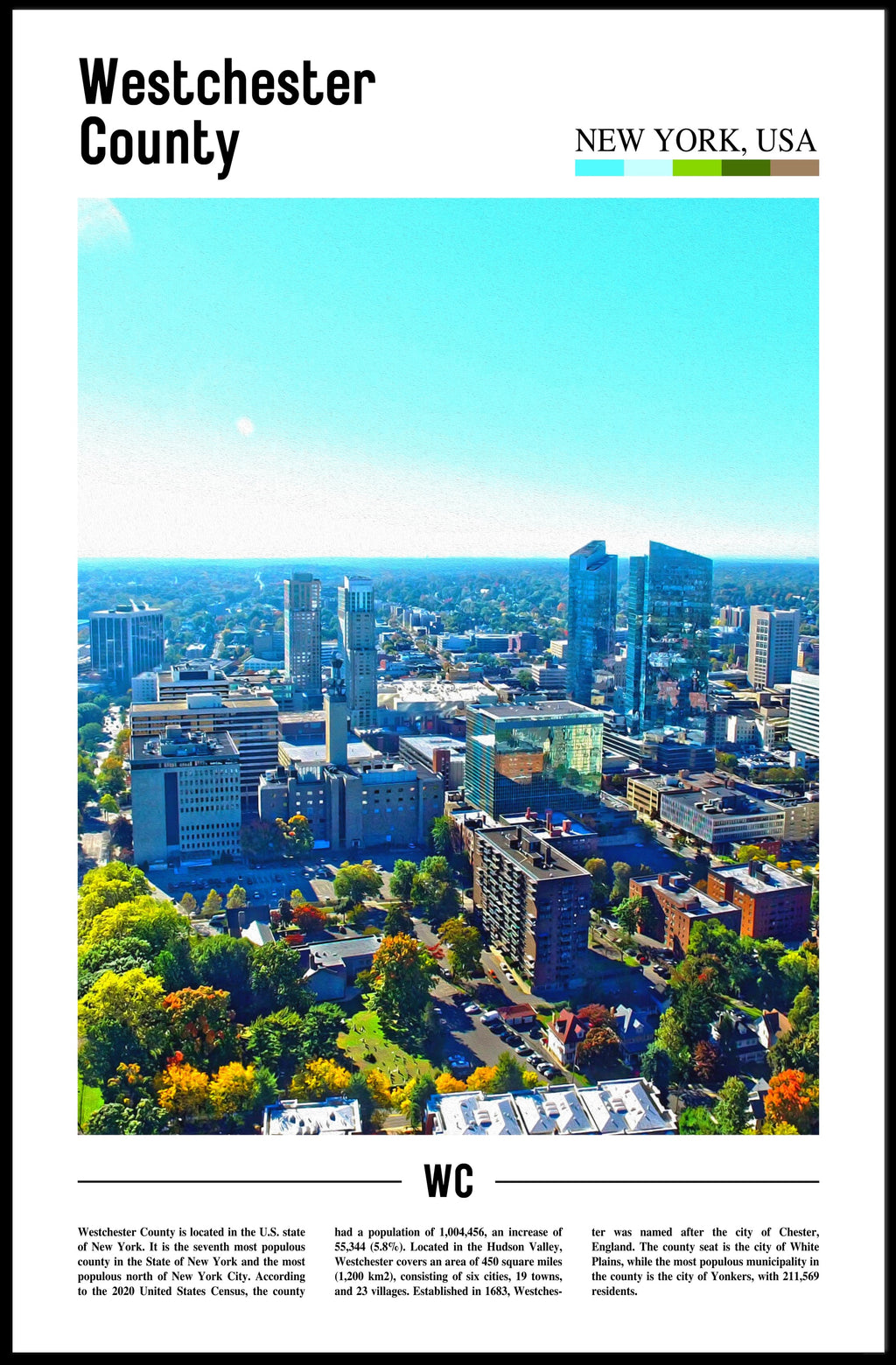 Westchester Aerial Cityscape Travel Art Poster from PosterGoat captures the sweeping contrast of glass-and-steel skyline and vibrant urban greenery in a single stunning aerial composition. Designed for lovers of modern cityscape wall art, this 18x24 poster brings Westchester County’s sophisticated energy and leafy Hudson Valley charm into any living space or office.