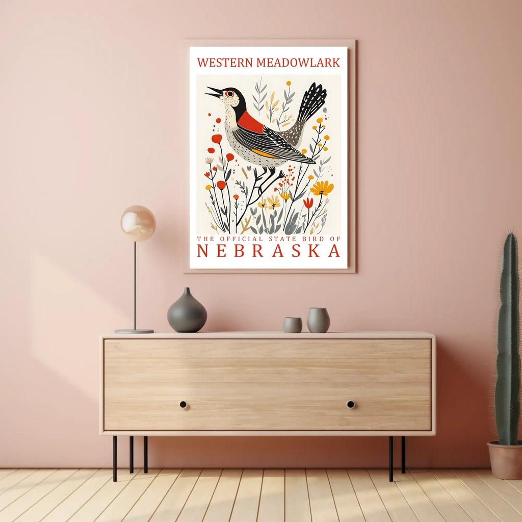Designed as both art and education, this poster fits easily into home decor collections—from rustic to contemporary—reflecting the prairie spirit through a serene nature poster. This educational art highlights the Nebraska state bird in a refined, accessible style. The minimalist art style emphasizes form and color, creating a durable piece that remains stylish for years.