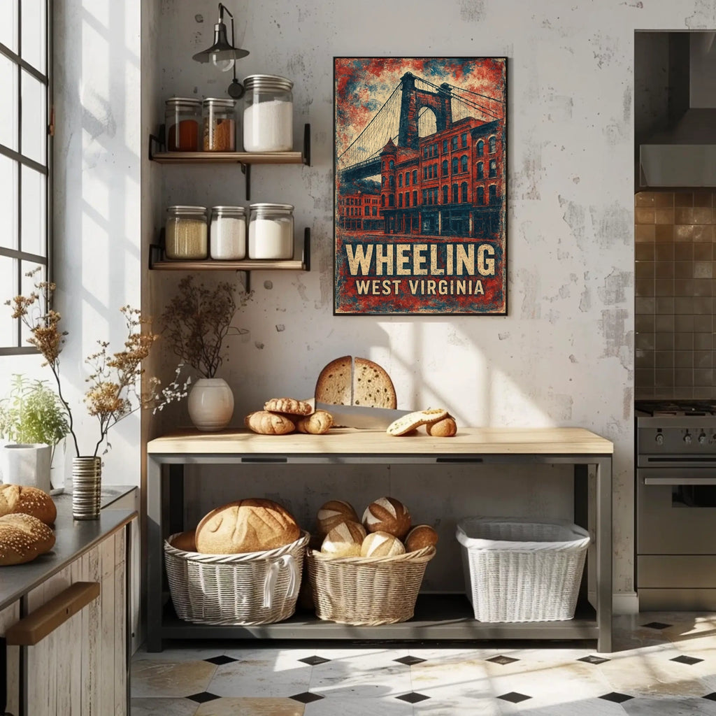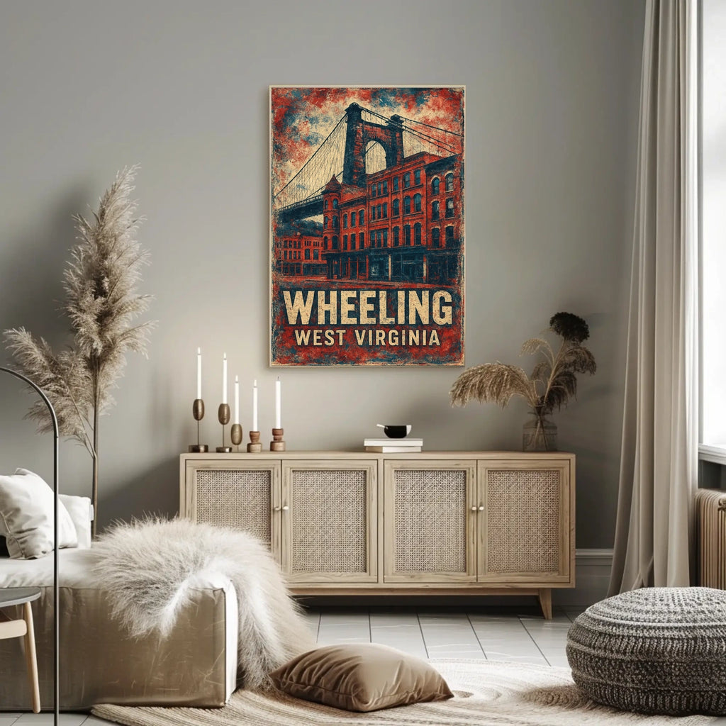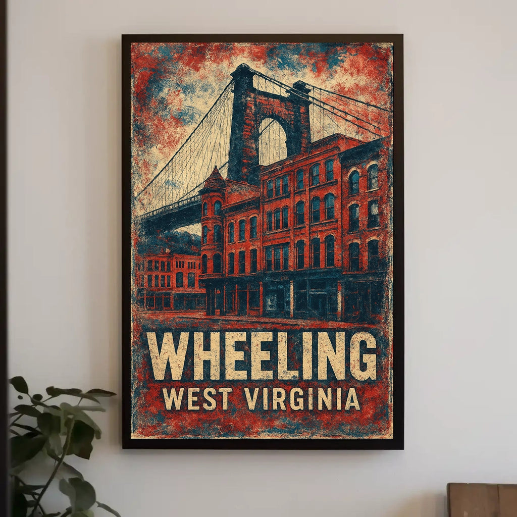 Bring Americana and West Virginia heritage into your home with a museum-quality print crafted to endure. The poster depicts a vintage-style Wheeling Suspension Bridge scene, enriched by historic brick buildings that celebrate the city's architectural heritage and industrial past.