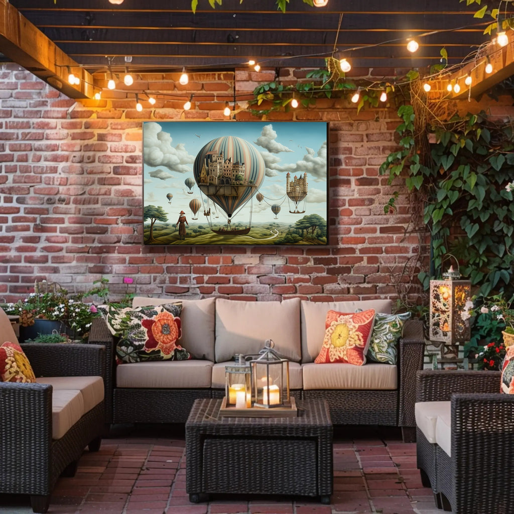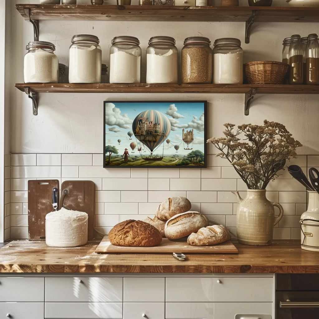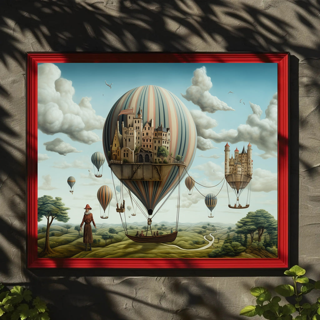 Dive into a captivating world of floating villages and castles with this surreal poster. It artfully blends whimsy and nostalgia, featuring hot air balloons adorned with intricate cityscapes and charming structures. A central balloon, striped in soft pastels, takes center stage with a miniature city perched on top. Echoing a bygone era, a figure in vintage attire observes the ethereal scene, evoking a sense of wonder and exploration. This poster beautifully captures the essence of fantasy and mythology, making it a unique addition to any art collection or dΓ©cor.