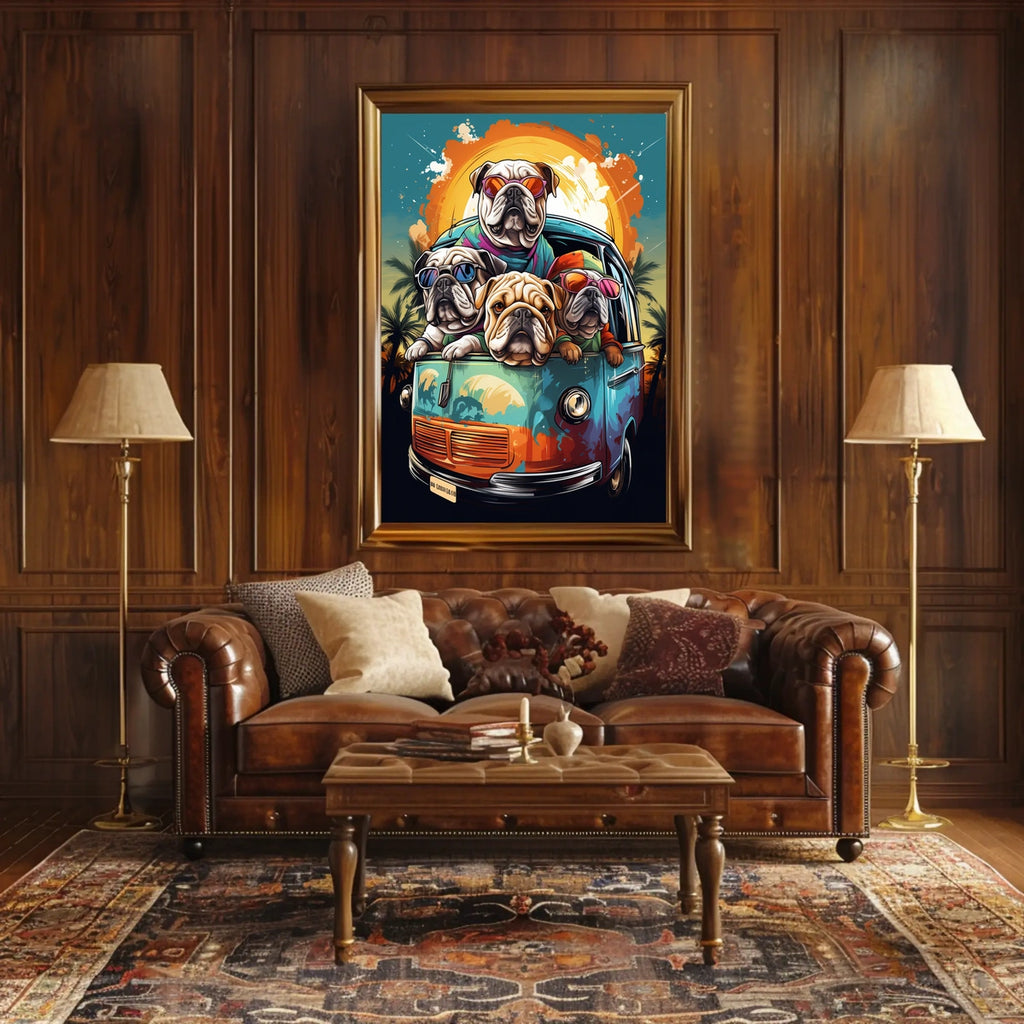Transform your space with this vibrant art poster featuring four whimsical bulldogs sporting colorful sunglasses, cruising in a retro-style van. Set against a bold sunset with palm trees, this piece captures a tropical, beachy vibe. The modern, cartoonish style, with its vivid colors and dynamic lines, creates a playful and carefree atmosphere.