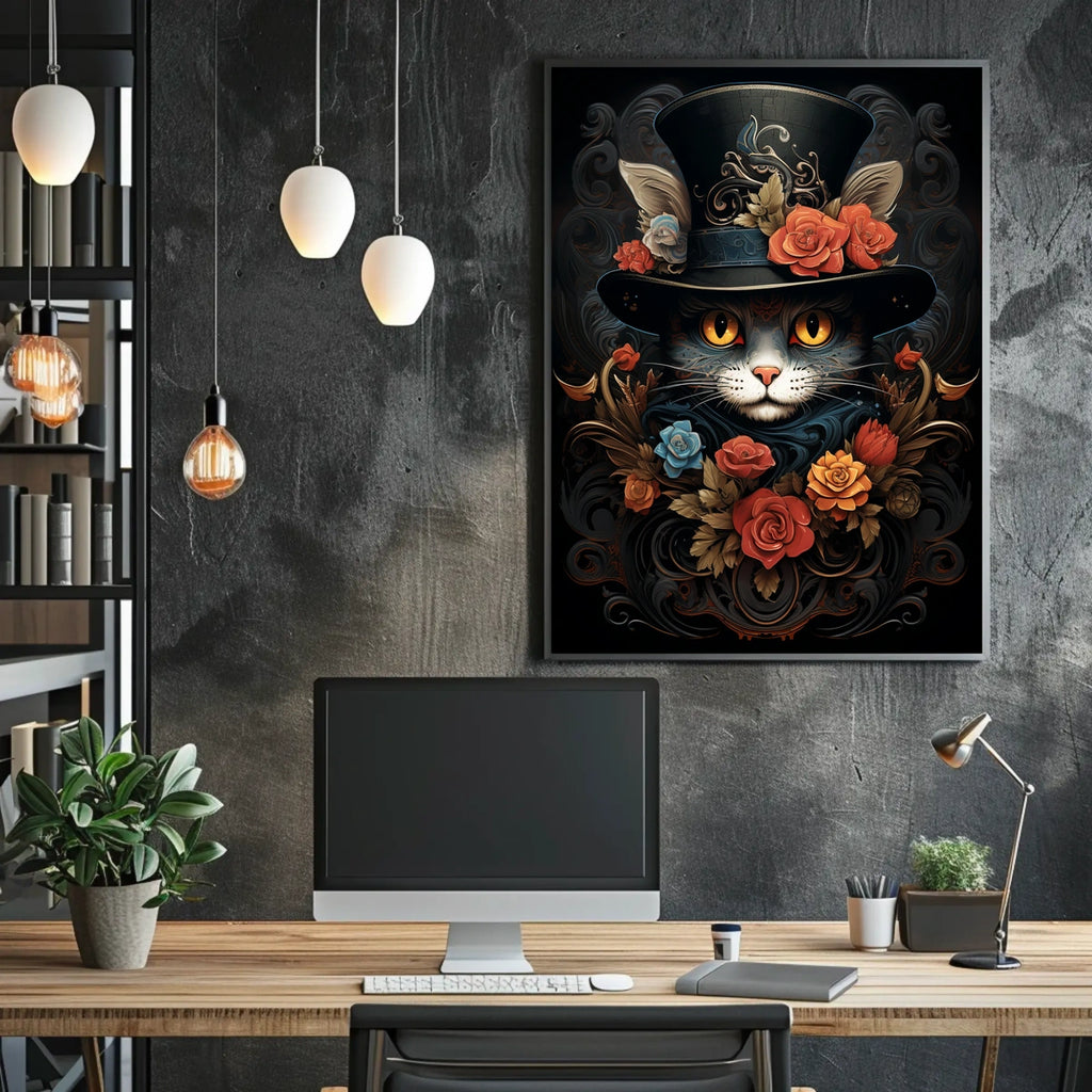 Whimsical Cat in Baroque Top Hat Fantasy Poster celebrates the beauty of whimsical animal imagery with a cat whimsically decorated by a richly adorned top hat. This feline’s large, expressive eyes draw you into a realm of fantasy, surrounded by intricate swirling patterns. Vibrant shades of red, blue, and orange flowers embellish the hat and background, creating a stunning visual contrast that exudes elegance. The baroque influence in the flowing embellishments adds an ornate touch, while the mystical mood blends a modern twist on vintage aesthetics. Perfect for fans of fantasy, whimsy, or detailed animal art.