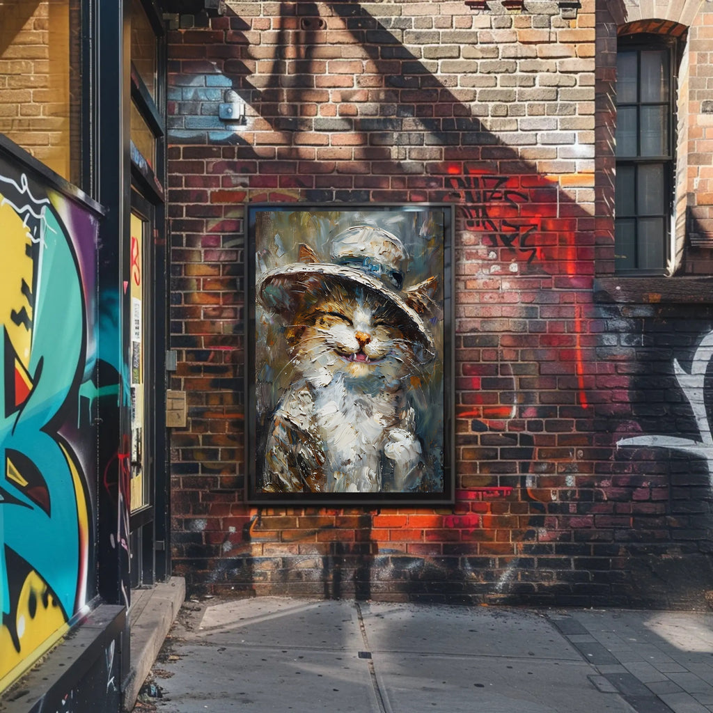 Add a burst of joy to your walls with the Whimsical Cat in Hat Artistic Animal Poster from PosterGoat — an impressionistic, playful portrait that blends vibrant color and bold brushstrokes to capture a cat's delighted expression in charming, painterly detail.