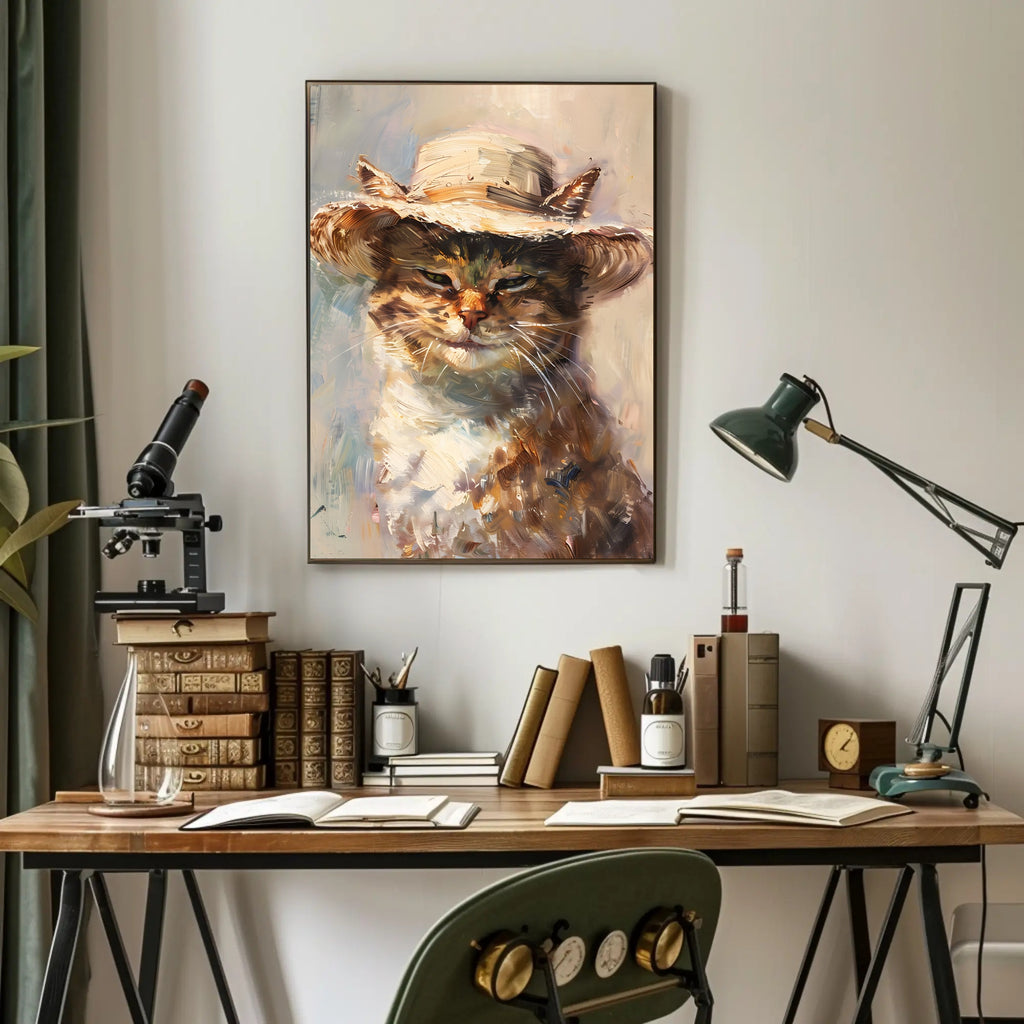 Celebrate the playful whimsy of this charming impressionistic painting featuring a delightful cat adorned with a light, summery straw hat. The artist's use of vibrant, swirling brushstrokes creates an animated sense of motion and texture, while the mix of colors in the cat's fur lends an expressive quality to the overall composition. With its whimsical theme, this poster is perfect for cat lovers and those who appreciate art that captures the lighthearted joy of life. Elevate your space with this captivating impressionistic masterpiece that brings playful elegance to any room.
