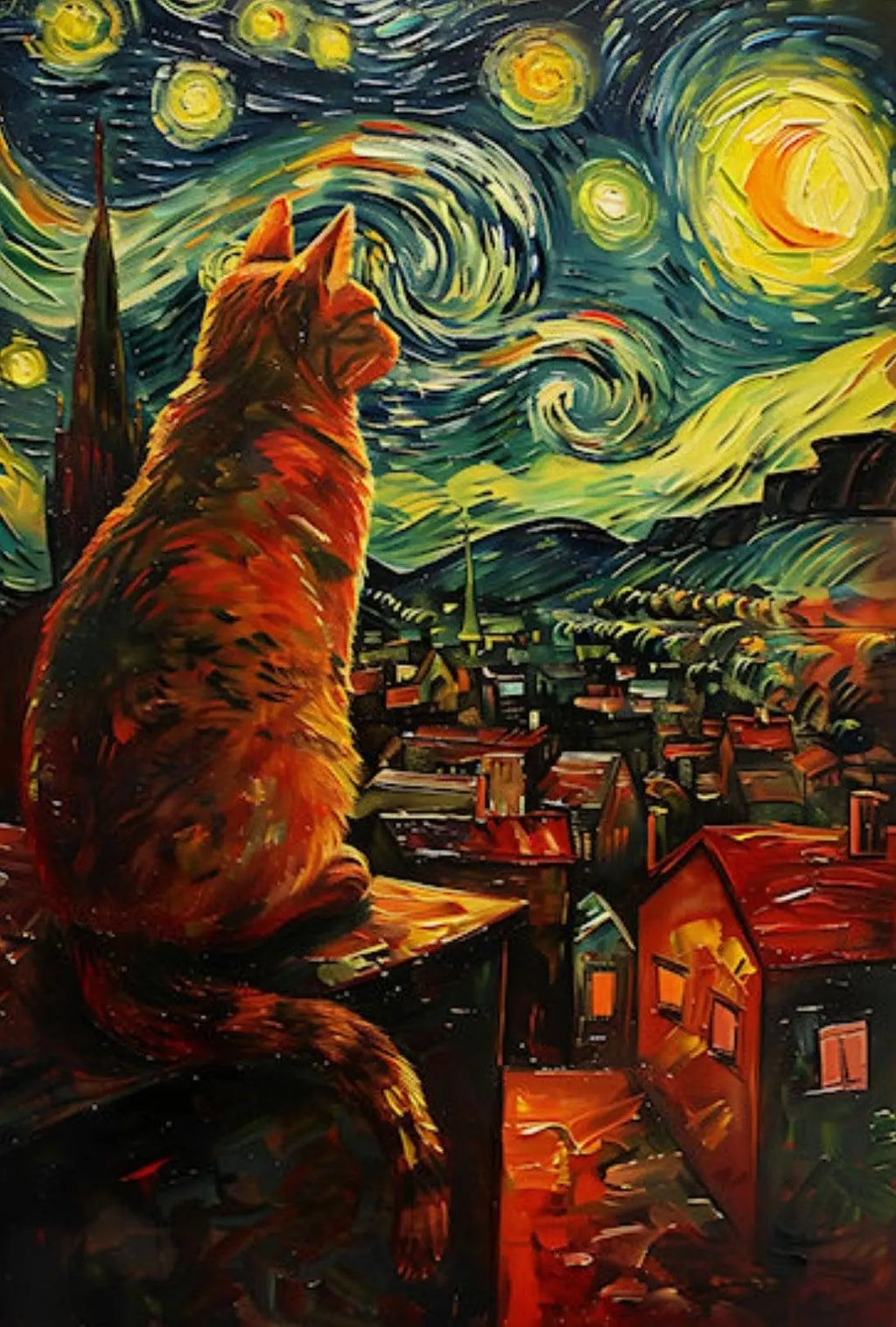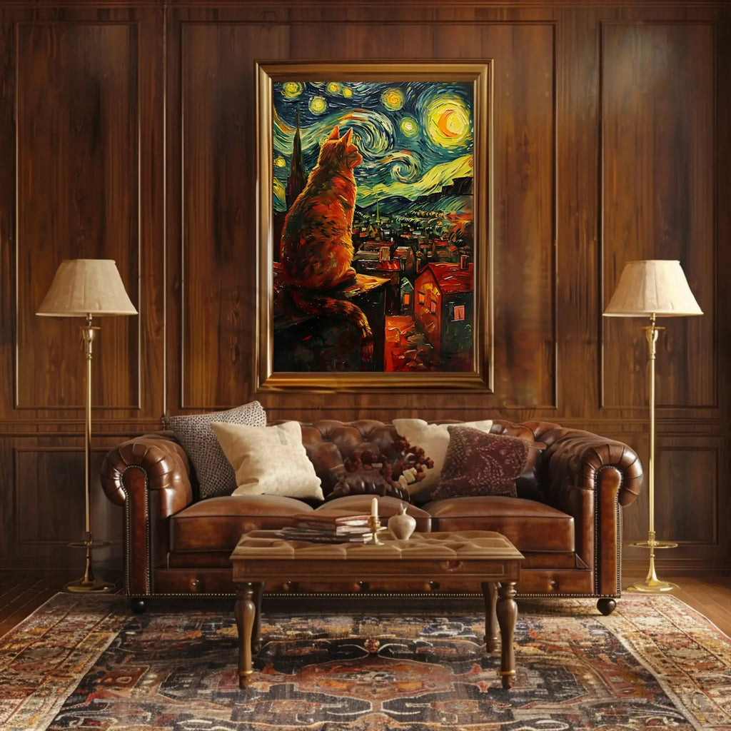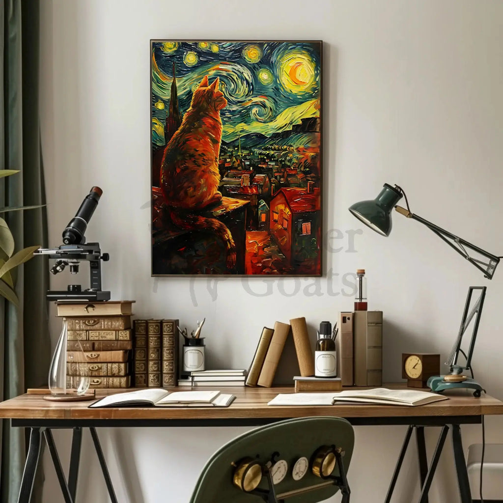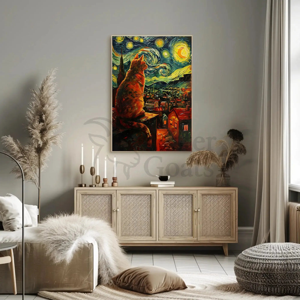 Bring a touch of dreamy Post‑Impressionist charm to your walls with the Whimsical Cat Rooftop Scene Artistic Poster from PosterGoat. This eye‑catching art print depicts a large, stylized cat perched on a rooftop, gazing over a glowing village beneath a swirling, starry night sky—an imaginative tribute to the textured, vibrant strokes of van Gogh’s style rendered in bold, contemporary color.