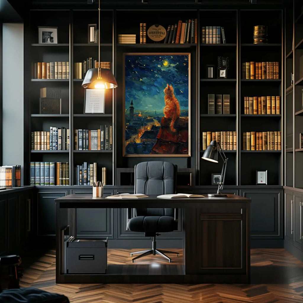Escape to a dreamy European night scene with this stunning artwork featuring an orange cat perched on a rooftop under a star-filled sky. The poster captures the serene and whimsical beauty of a quaint town, framed by unique architectural elements like a charming clock tower. The impressionistic brushstrokes create a captivating atmosphere that invites wonder and contemplation. Set against deep blues and blacks, the warm hues of the cat and city lights add vibrancy and intrigue to any space. Perfect for those who appreciate art with a touch of magic and wonder.