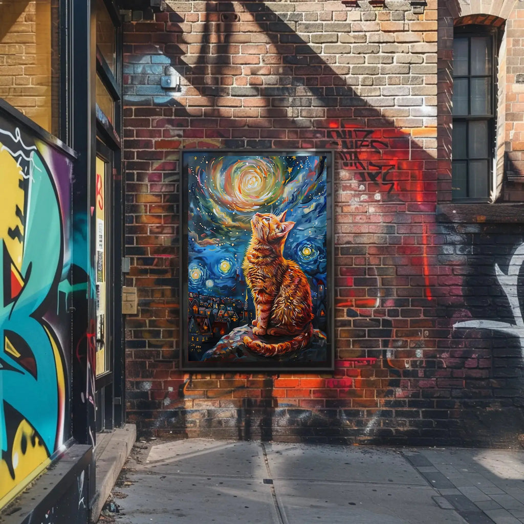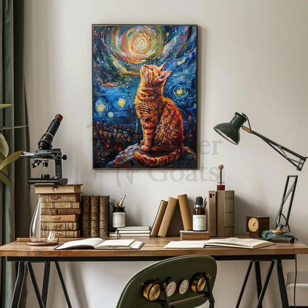Whimsical Cat Under Starry Sky Artistic Poster from PosterGoat transforms any wall into a dreamscape — a vibrant fusion of post-impressionism and modern digital flair. This striking 24x36 poster captures an orange tabby gazing upward at a swirling, star-filled sky rendered in deep blues, bright oranges, and energetic brush strokes reminiscent of Van Gogh. The composition pairs playful feline charm with dramatic, swirling light to create a truly memorable piece of wall decor.