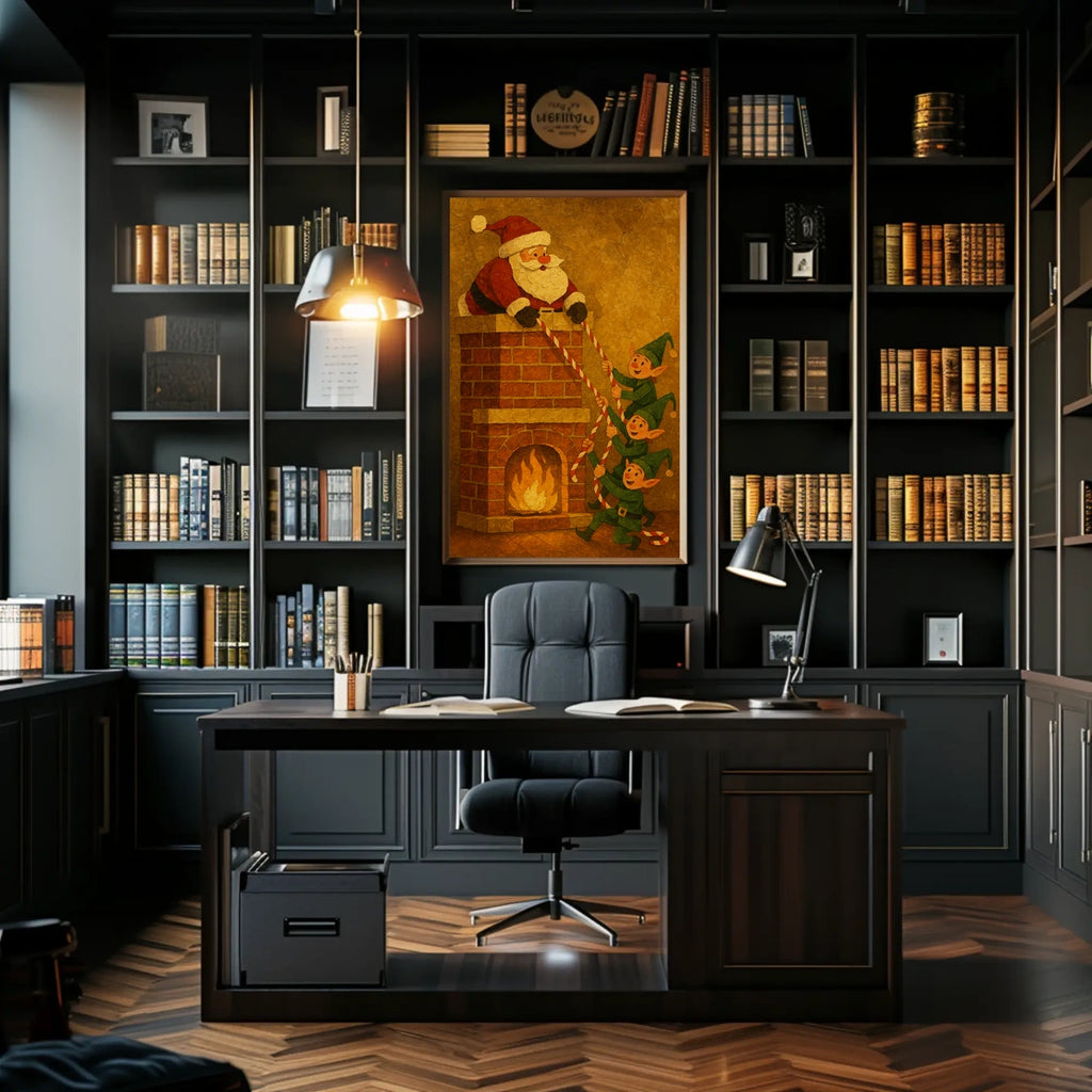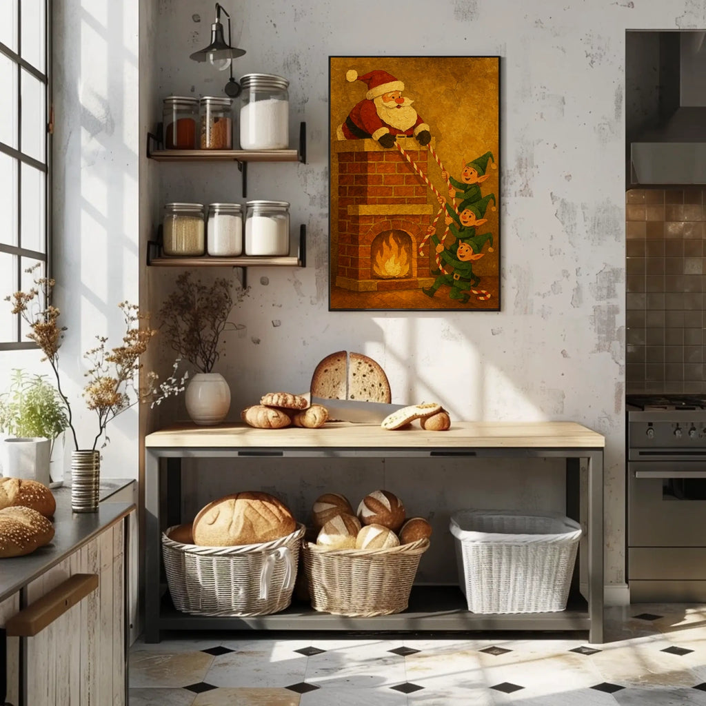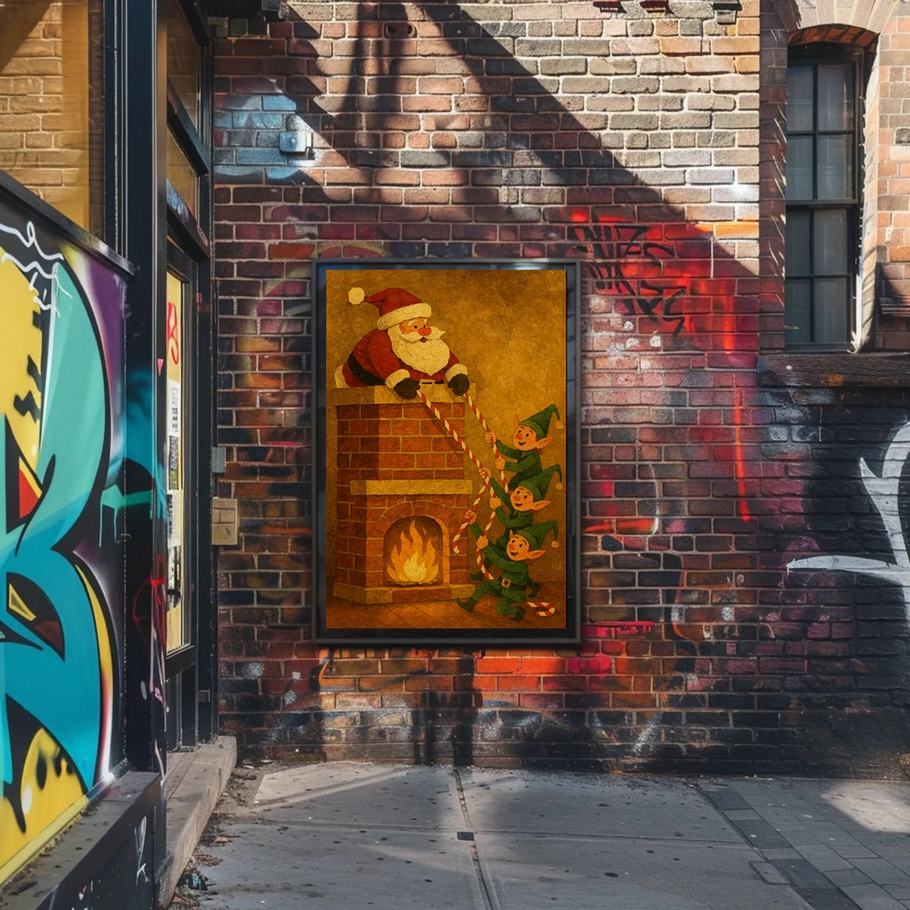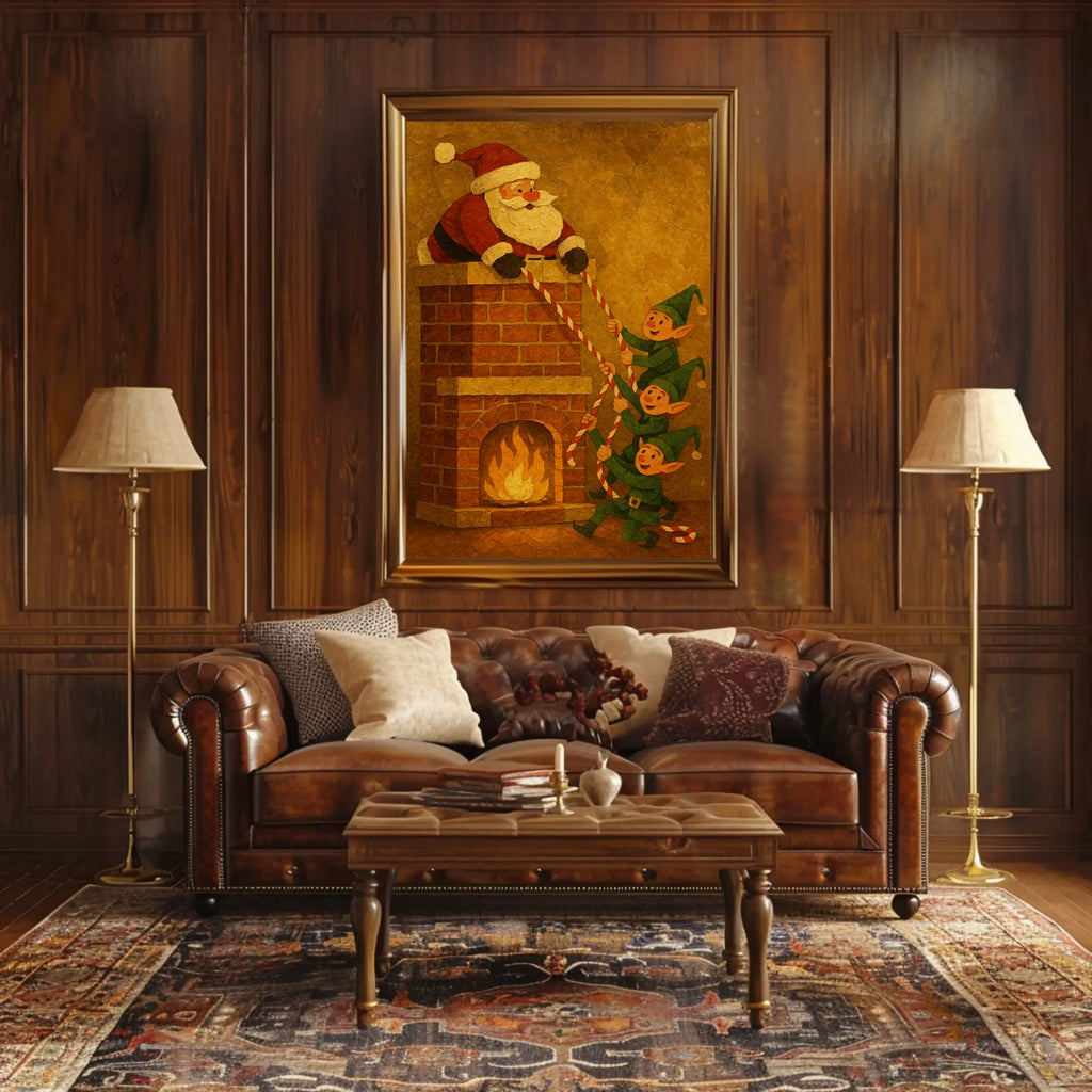 Experience the joy and warmth of the holiday season with a poster that showcases Santa Claus and his charming elf helpers in a delightful Christmas scene. Santa stands atop a brick chimney, assisted by three cheerful elves dressed in vibrant green outfits with whimsical pointy hats, holding candy cane-striped ropes. The cozy glow inside the chimney adds a touch of warmth to the atmosphere, inviting you to linger over each playful detail.