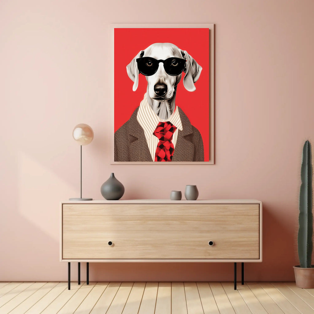 Introducing the Whimsical Doggy Style: Pop Culture Poster, an enchanting piece of contemporary pop culture art that effortlessly brings humor and charm to any wall. This delightful poster features a beautifully illustrated dog outfitted in a chic ensemble, complete with oversized sunglasses, a stylish brown checkered blazer, a trendy striped shirt, and a striking red checkered tie. The playful essence of this humorous animal poster will instantly elevate your home decor, making it a perfect addition for those seeking quirky home decor that stands out, complements modern spaces, and showcases a love for funny dog dressed up art.