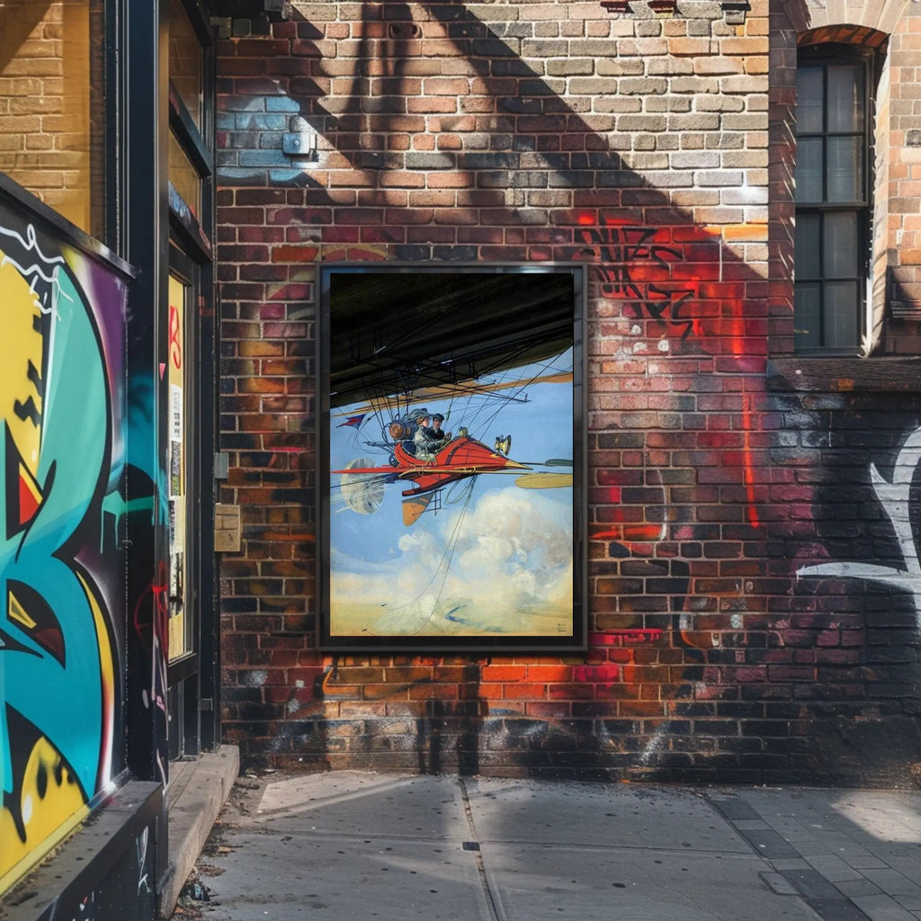 Iconic imagery: Hand-drawn style details — the glossy red fuselage, spinning propellers, delicate suspension wires and soft cloudscapes — create a dynamic focal point that reads beautifully from across a room.