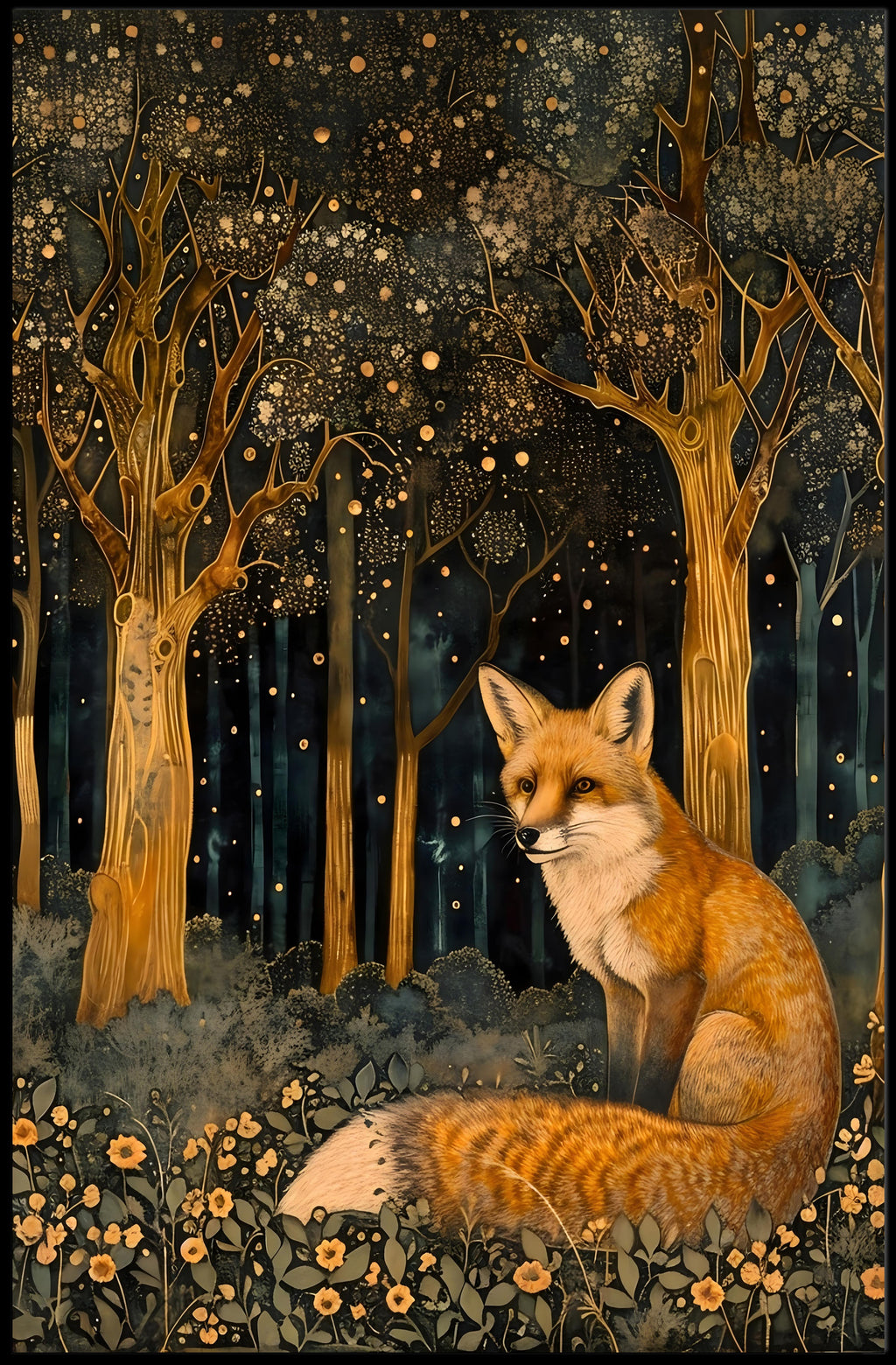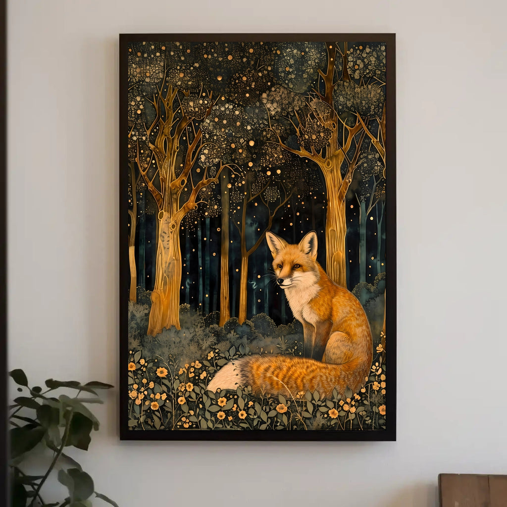 Immerse yourself in a magical world with the Whimsical Fox in Enchanted Forest Fantasy Poster from PosterGoat. This enchanting wall art features a whimsical fox nestled in a fantastical forest, surrounded by stylized trees adorned with intricate, golden leaves. The warm amber glow of the foliage creates a dreamlike atmosphere that will elevate any space.
