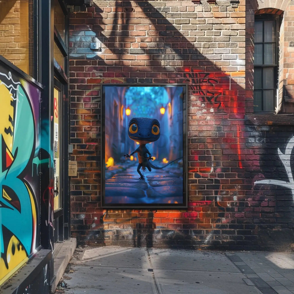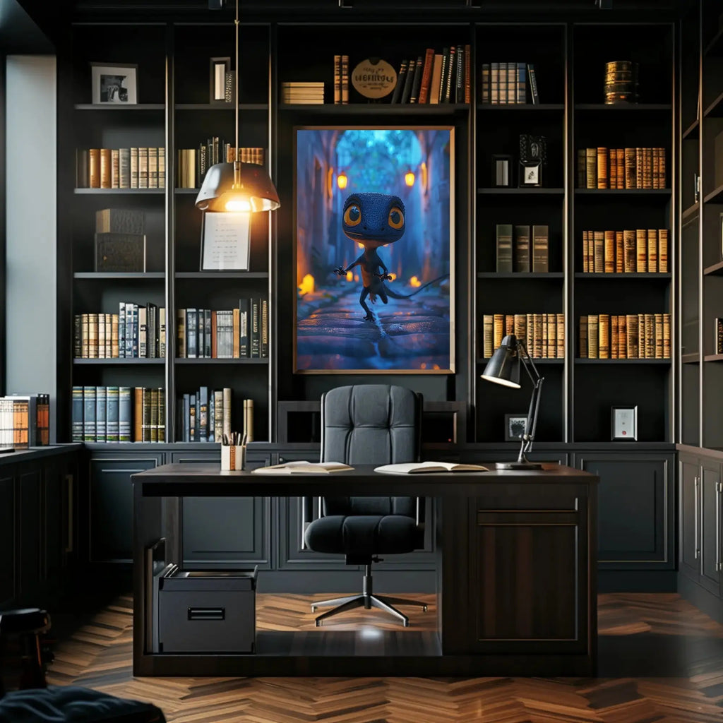 Bring a fairy-tale evening to your walls with the Whimsical Gecko Adventure in Fantasy Village Animal Poster from PosterGoat. This vibrant 18x24 poster captures a playful gecko mid-adventure along a glistening cobblestone path, framed by warm lantern light and dreamy, old-world architecture. Rich deep-blue tones contrast with glowing orange highlights to create a magical ambiance that draws the eye and sparks the imagination.