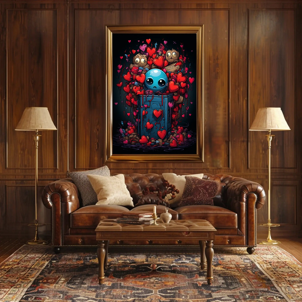 Whimsical Heart Explosion: Surreal Cartoon Art Poster invites you into a playful, slightly eerie world where emotion, imagination, and color collide. At its heart, a blue, wide-eyed character sits on a pedestal, surrounded by an explosion of red and pink hearts—some dripping, others floating—set against a dramatic dark background. Wooden textures and cartoonish figures peeking from the sides add depth and a tactile, whimsical energy to this surreal art poster.
