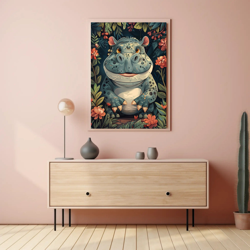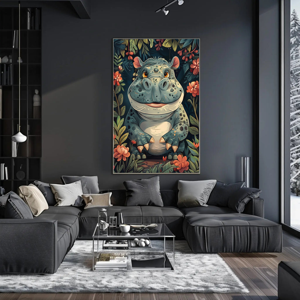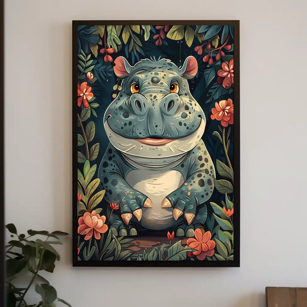 Theme & mood: Whimsical jungle scene featuring a friendly hippo — ideal for nurseries, living rooms, offices, or gifting.