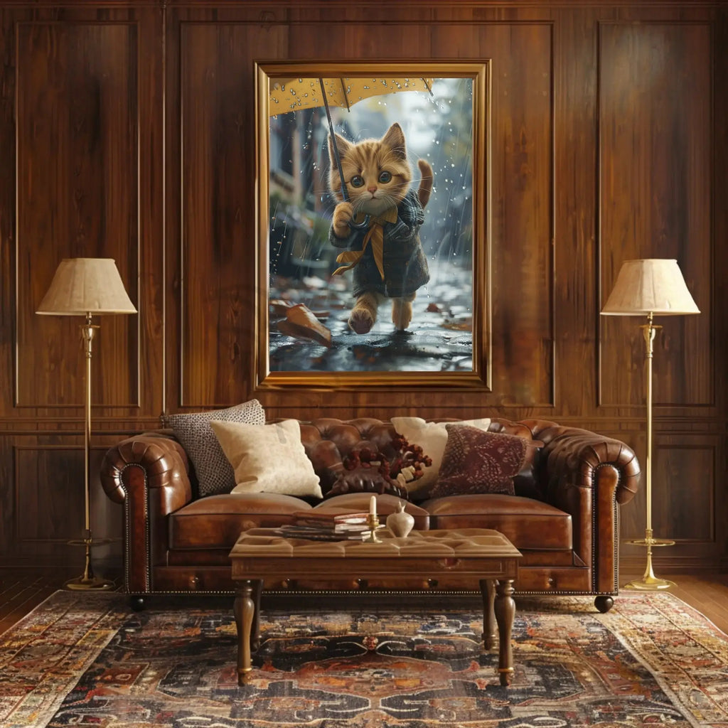 Add a touch of cozy charm to your walls with the Whimsical Kitten in Rainy Autumn Scene Animal Poster from PosterGoat. This enchanting illustration captures a wide-eyed kitten in a plaid coat, clutching a yellow umbrella as raindrops sparkle and golden leaves drift across a wet cobblestone street — a perfect blend of warmth, whimsy, and seasonal atmosphere for any home or office.