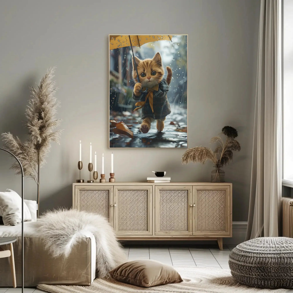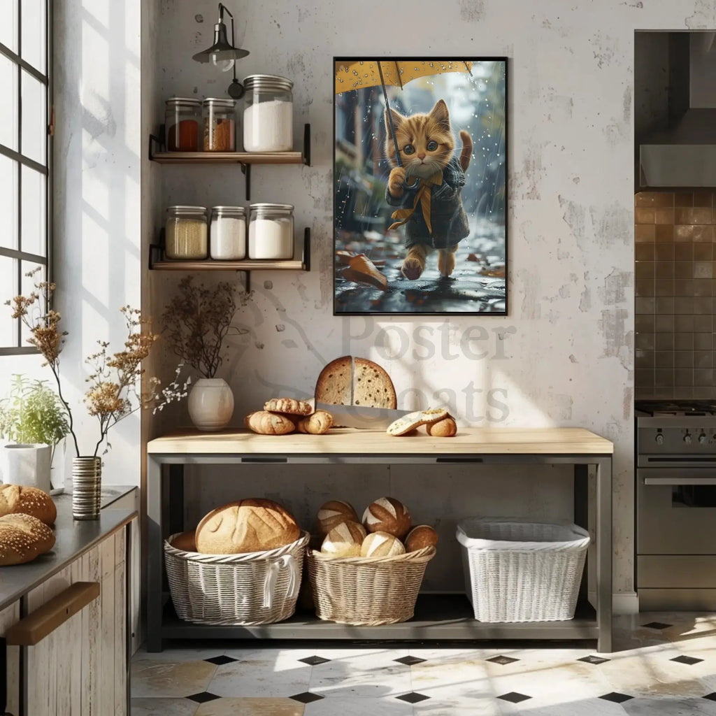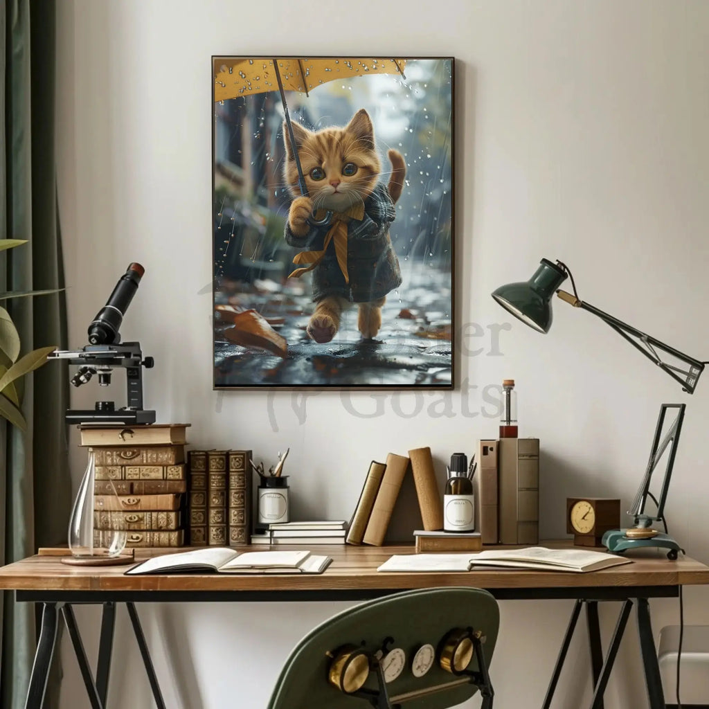 Bring home this delightful rainy-day scene and let the whimsical kitten brighten your space. Order now from PosterGoat and transform your walls with a touch of autumnal magic.