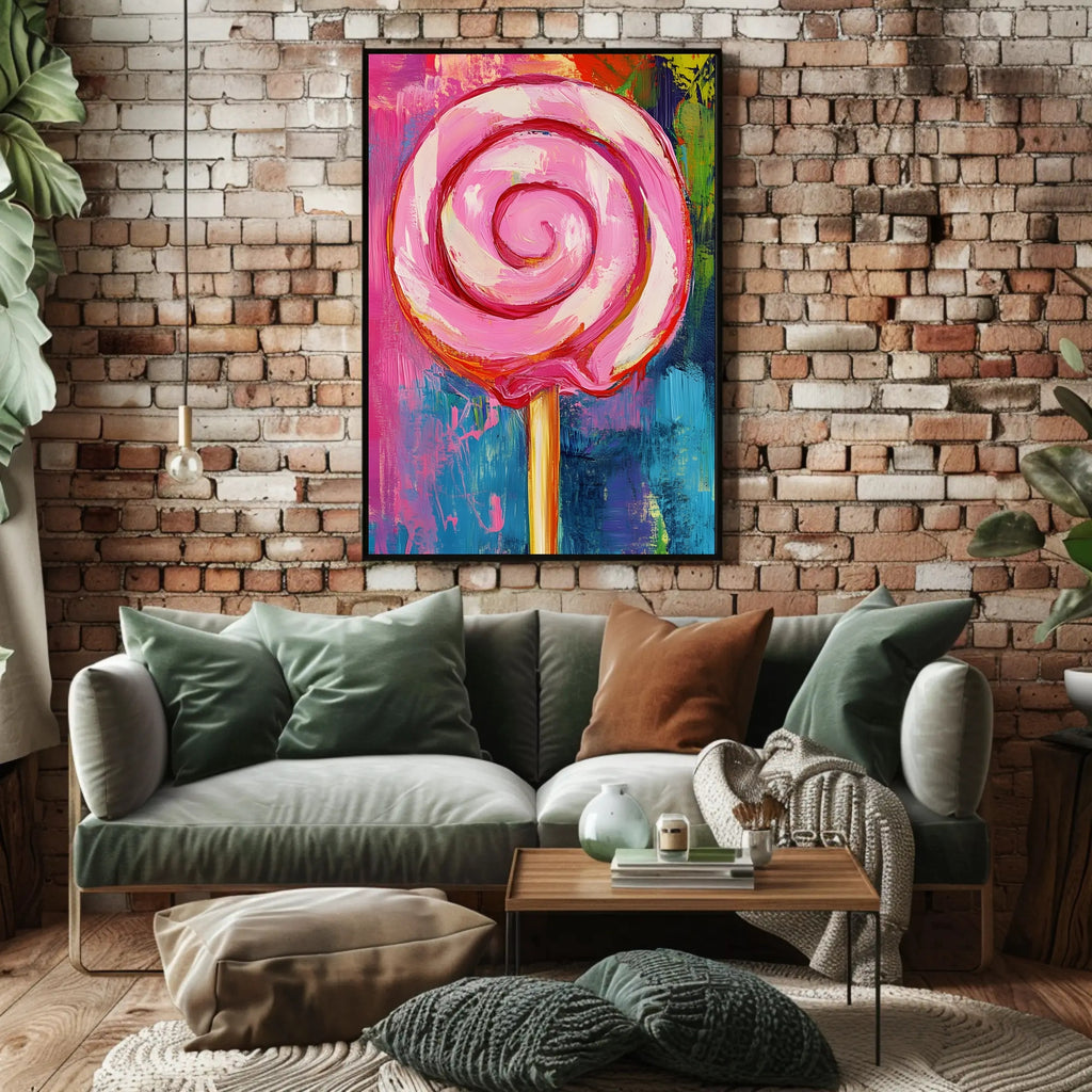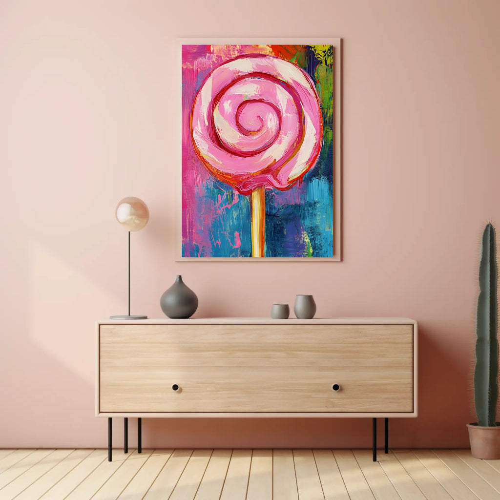 Why you'll love it: The oversized spiral motif and visible impasto texture recreate the energy of an original painting, making this poster a cheerful focal point in living rooms, nurseries, offices, or creative spaces. The candy-inspired imagery and whimsical style add instant personality while staying modern and artful.