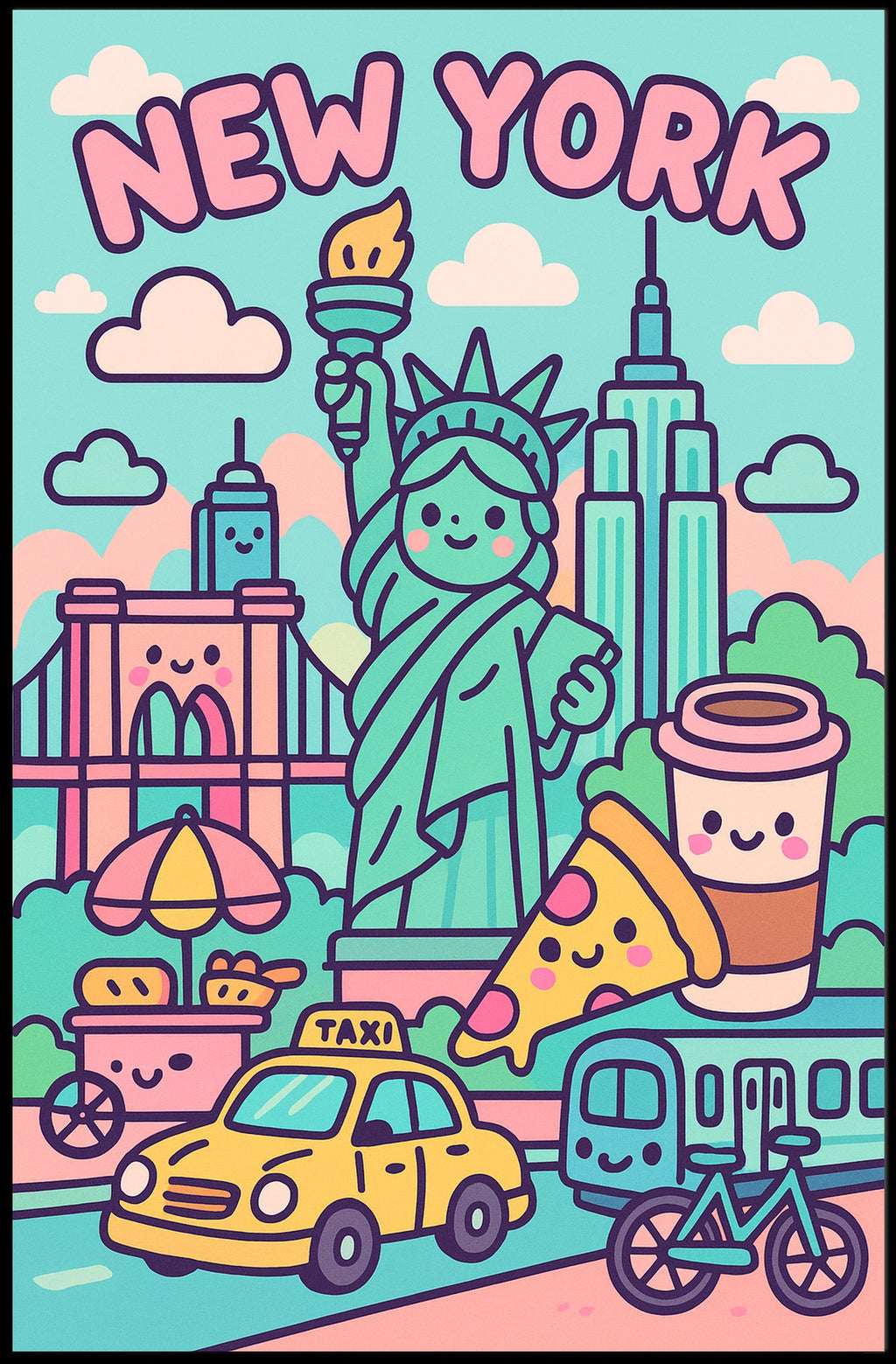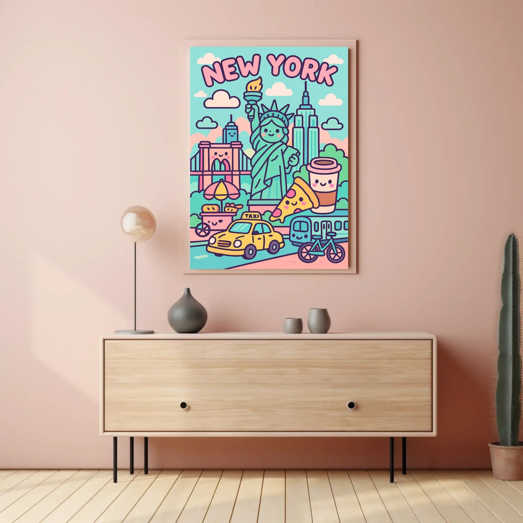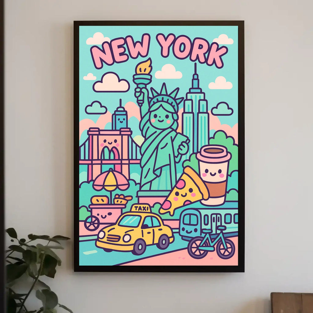 Immerse your space in the vibrant energy of New York City with the Whimsical New York Adventure Poster. This playful artwork blends iconic symbols—the Statue of Liberty, a classic yellow taxi, and a flavorful slice of pizza—into a colorful, mood-lifting scene that sparks joy and conversation in any room.