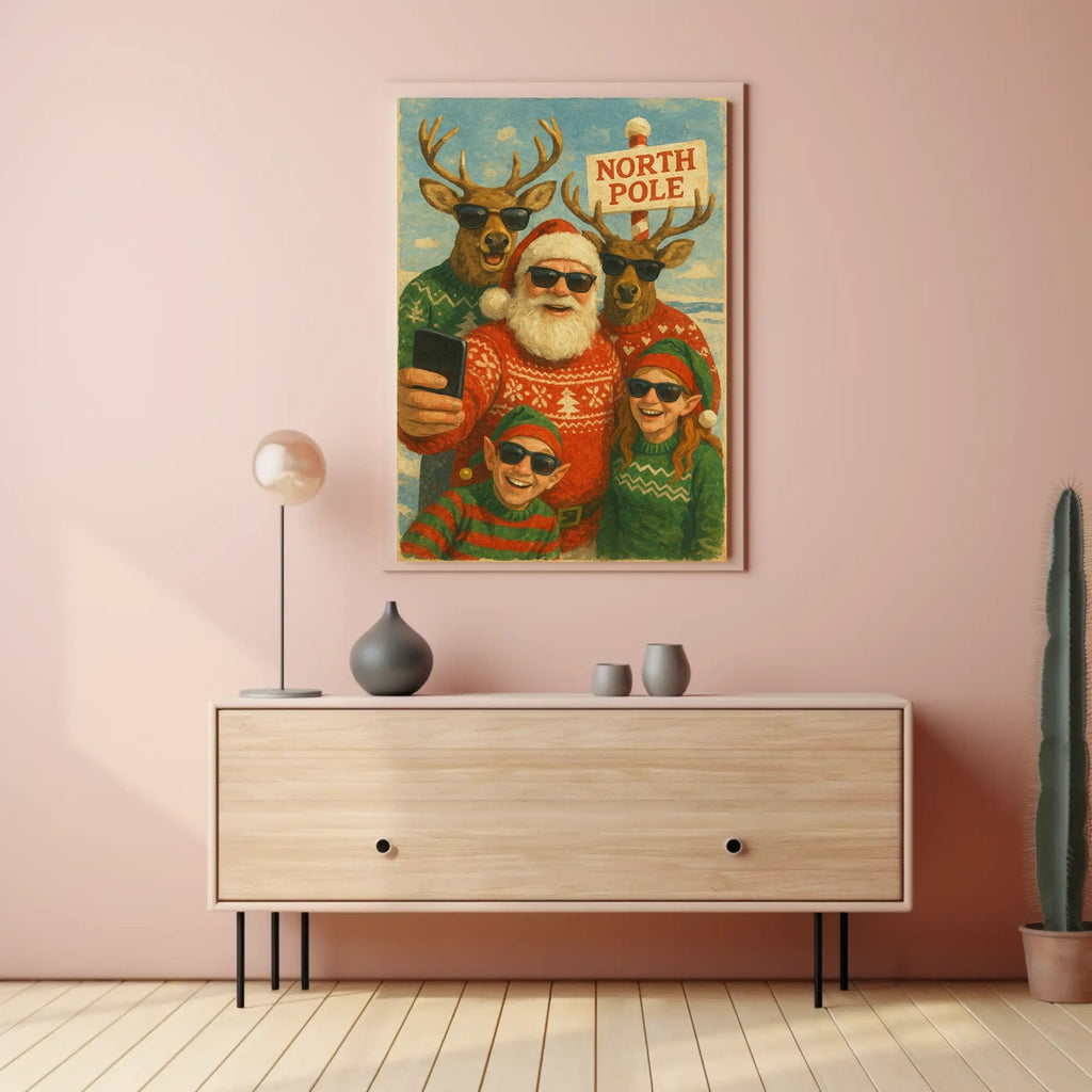 Celebrate the magic of the holiday season with this Whimsical North Pole Selfie Vintage Christmas Poster. The central figure, dressed as Santa Claus, joyfully snaps a selfie with his merry companions: two reindeer and two playful elves. Each character sports festive sweaters and stylish sunglasses, adding a humorous twist to the classic Christmas imagery. The vintage artistic style and a cheerful, playful mood make this poster a perfect choice for family-friendly holiday décor or promotions.