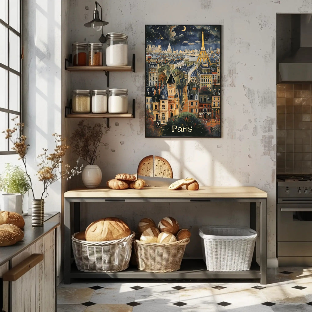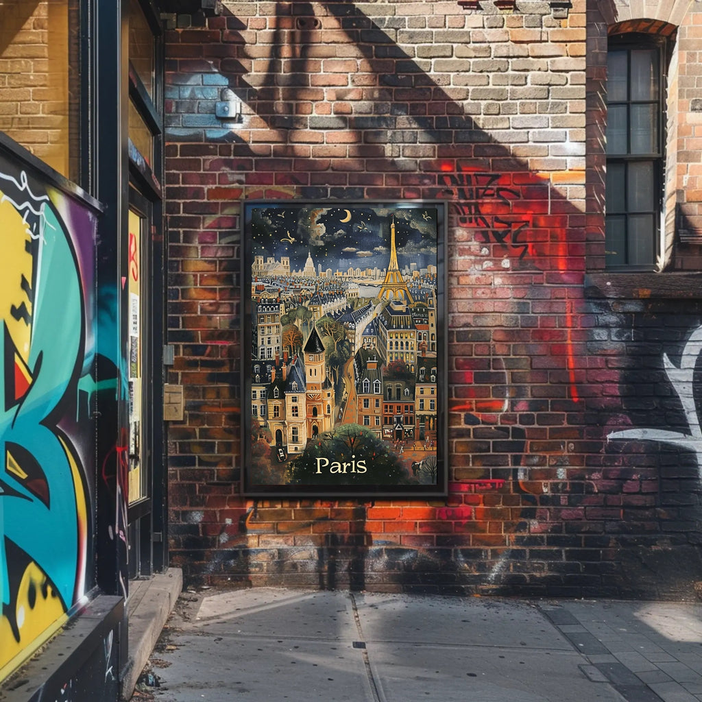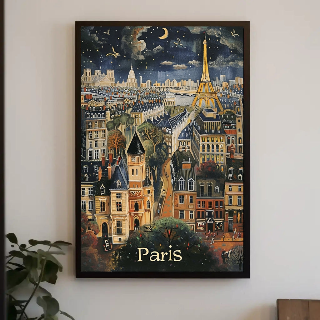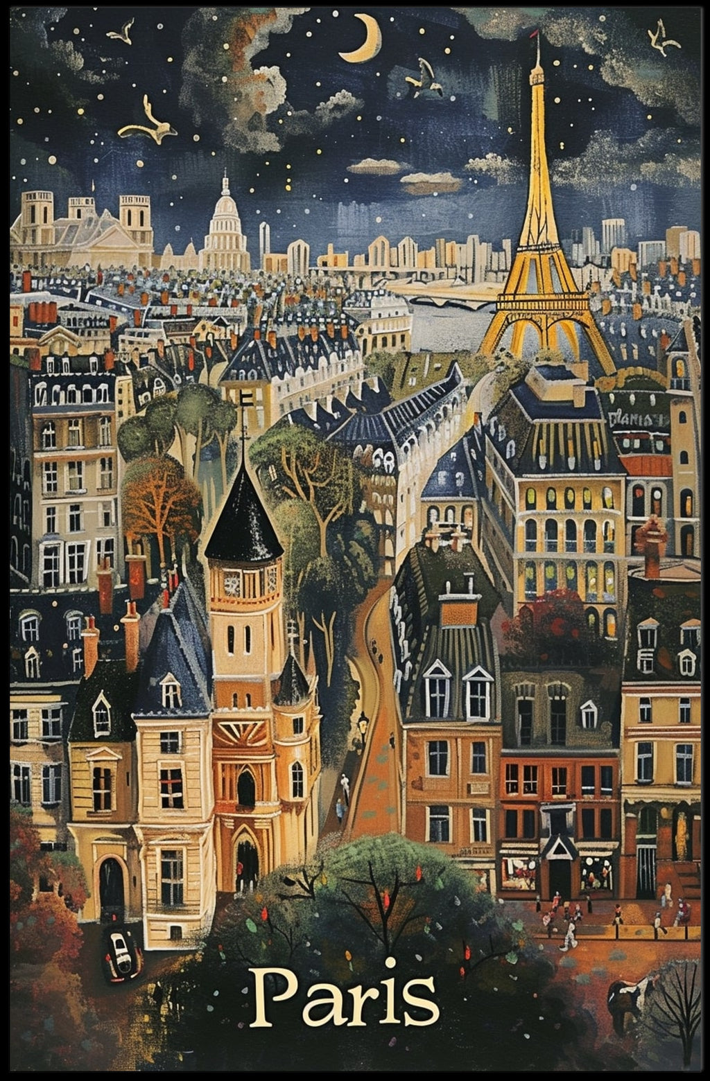 Step into a world of romance and wonder with this stunning poster that brings the magic of Paris to life. Featuring iconic Parisian landmarks like the Eiffel Tower and the charming skyline, this illustration captures the essence of the City of Light. Painted in a rich, warm palette, the whimsical style evokes a sense of nostalgia and storybook allure. The dreamy night scene, complete with a crescent moon and twinkling stars, transports viewers to a place of enchantment and adventure. Perfect for lovers of travel and art, this piece celebrates the timeless charm and allure of Paris.