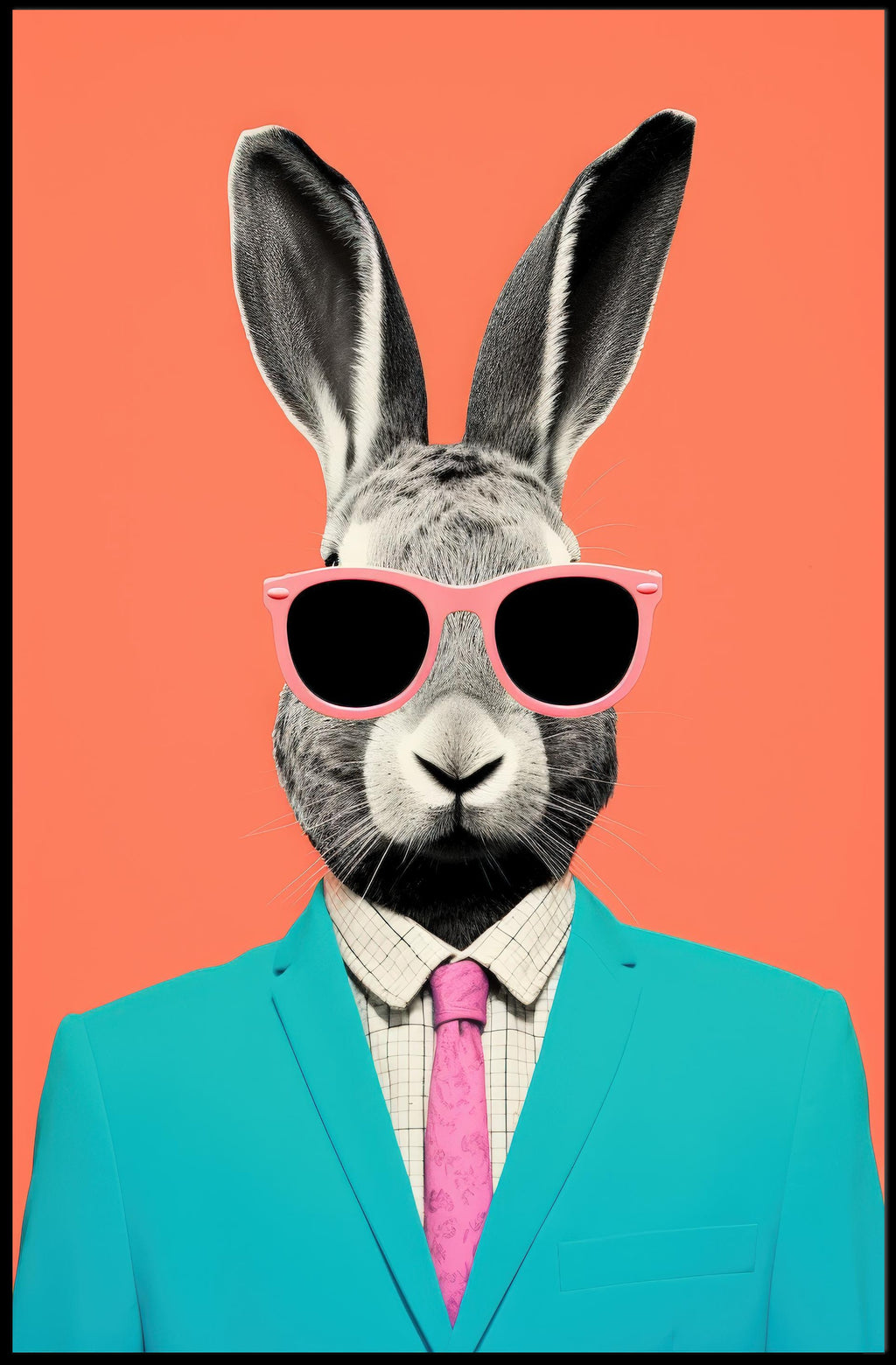 Make a statement with playful sophistication. The Whimsical Rabbit in Teal: Pop Culture Poster from PosterGoat blends photorealistic detail with bold pop‑art color — a dapper rabbit in a teal suit, checked shirt and bright pink tie, finished with oversized pink sunglasses against a vibrant orange backdrop. This eye‑catching piece fuses Mid‑Century Modern charm with surreal, contemporary design to elevate any wall in your home or office.