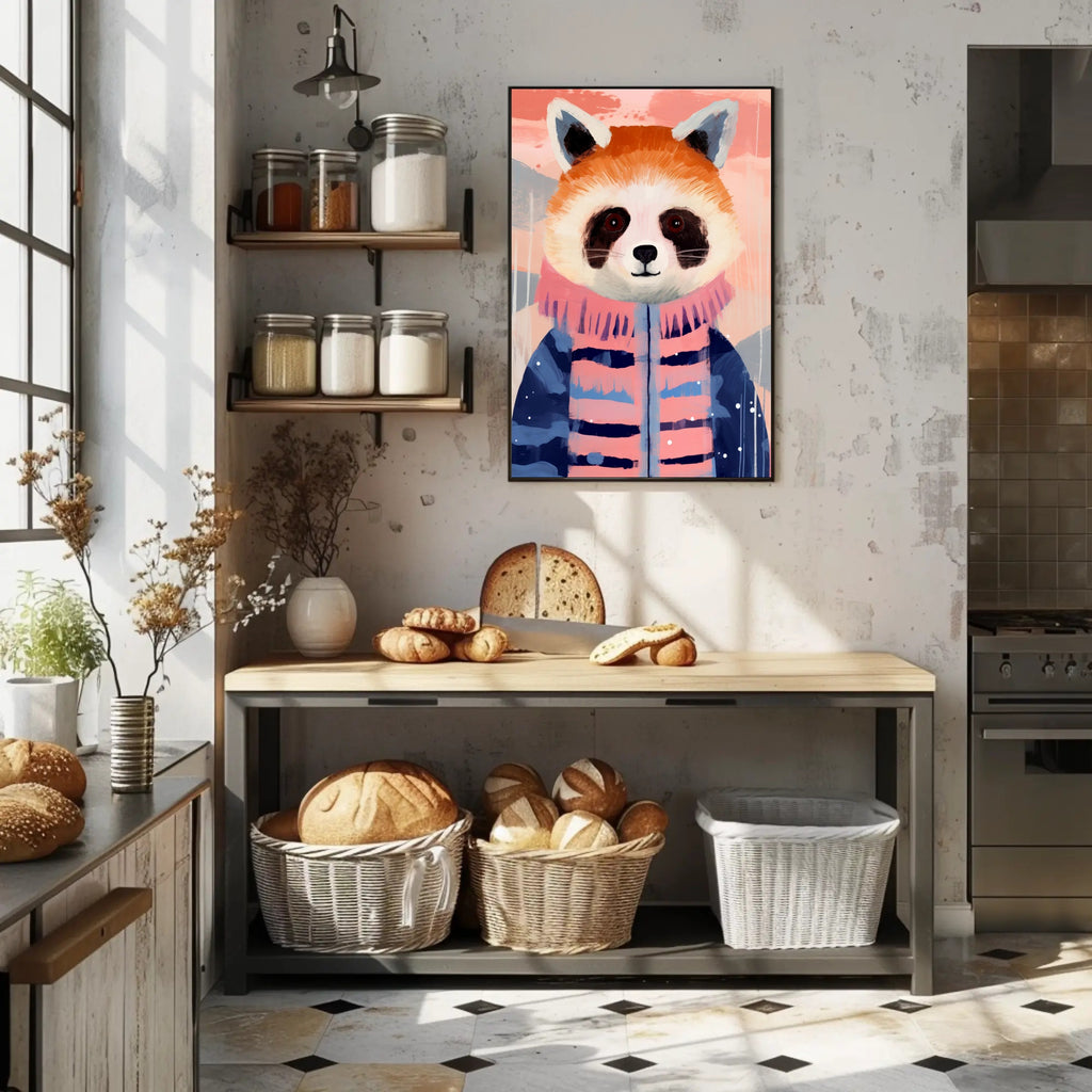 Bring playful charm and contemporary color to any room with the Whimsical Red Panda Animal Poster from PosterGoat. This modern, painterly illustration features an anthropomorphized red panda with large, expressive eyes and distinctive fur markings — wrapped in a bold pink and blue striped scarf that instantly becomes the focal point of your wall.
