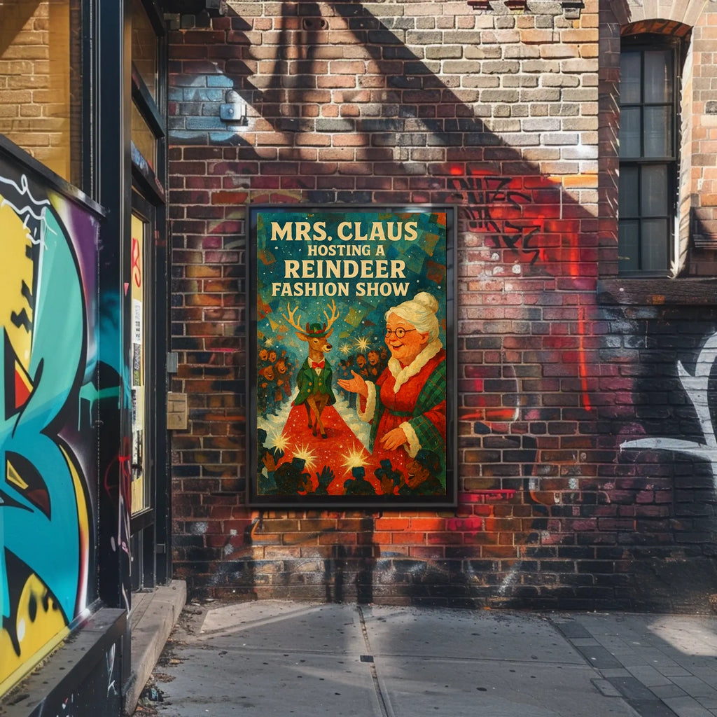Delight in a playful scene hosted by the ever-stylish Mrs. Claus, where a confident reindeer struts down a vibrant red carpet in a green suit and holly-adorned hat. The snowy, light-dappled backdrop and the audience’s joyful response amplify the Christmas magic, making this poster a bright nod to festive pop culture traditions.