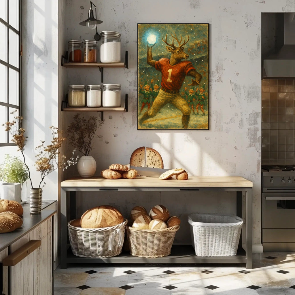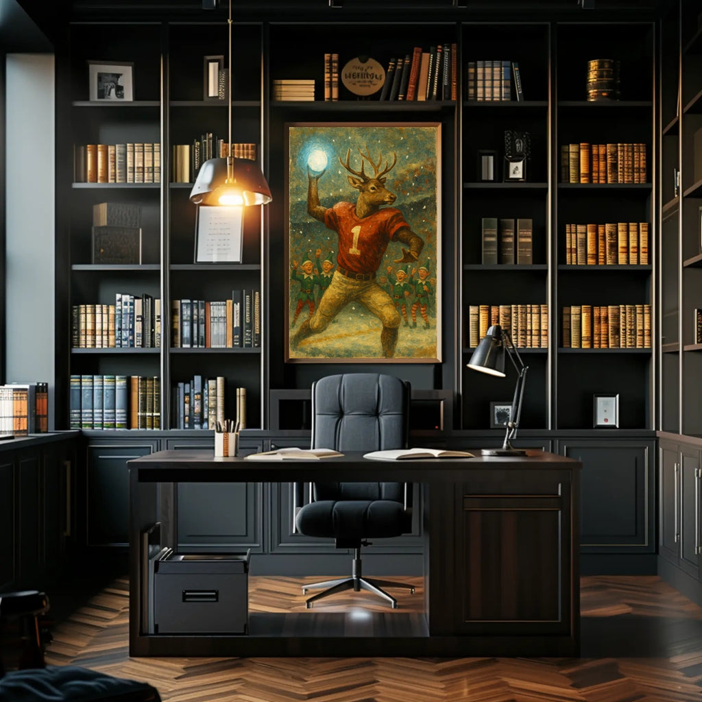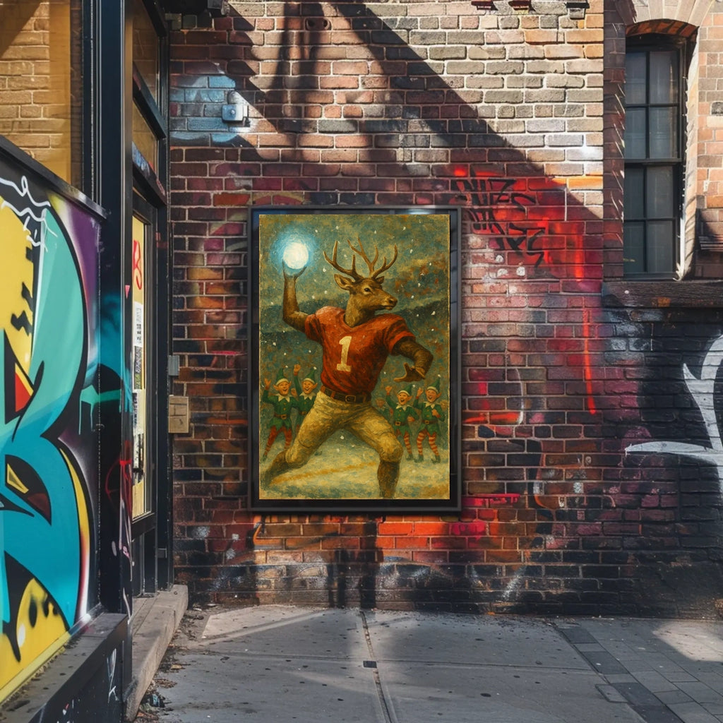 This enchanting poster captures a surreal and festive holiday scene that blends sports, fantasy, and classic Americana. At its heart is a reindeer with a human-like body, clad in a vintage American football uniform emblazoned with the number "1." The reindeer holds a glowing snowball, adding a touch of magic to the painterly depiction. Encircled by joyous elves in classic green attire, complete with red and white striped leggings, the snowy backdrop enhances the nostalgic Americana aesthetic. This captivating artwork beautifully merges sports, fantasy, and holiday cheer, making it an ideal choice for vintage holiday enthusiasts.