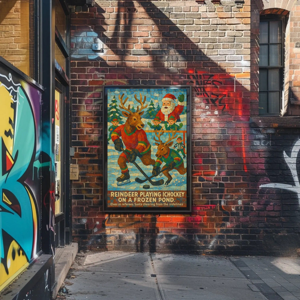 Bring the magic of the season into your home, classroom, or office with this distinctive poster, and let your walls tell a joyous winter story. Perfect for those seeking to add a touch of cheer to their Christmas theme, the mosaic-style reindeer ice hockey scene offers a festive centerpiece that complements traditional and modern decor.