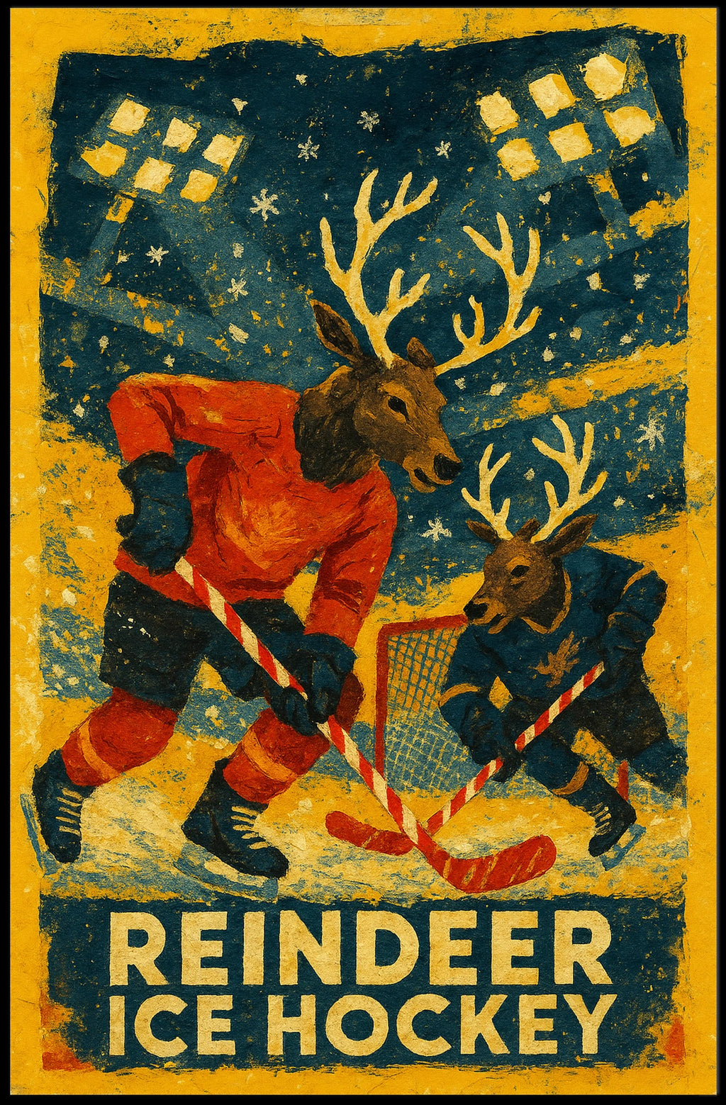 Detailed design highlighting the playful reindeer athletes in vibrant hockey gear under a starry sky and stadium lights